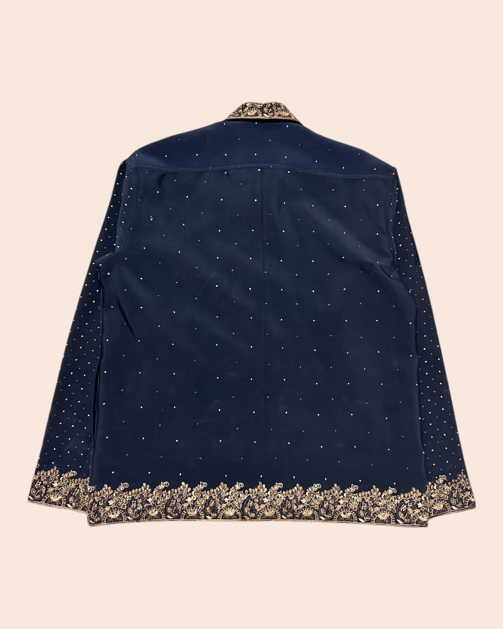 Aari hand embroidered jacket made from vintage saree. Embroidered with the Aari technique. The name aari comes from the hooked needle used for the embroidery, which allows artisans to create fine chain stitches quickly. The embroidery is done on a stretched fabric using a wooden frame called an adda, giving it precision and tension