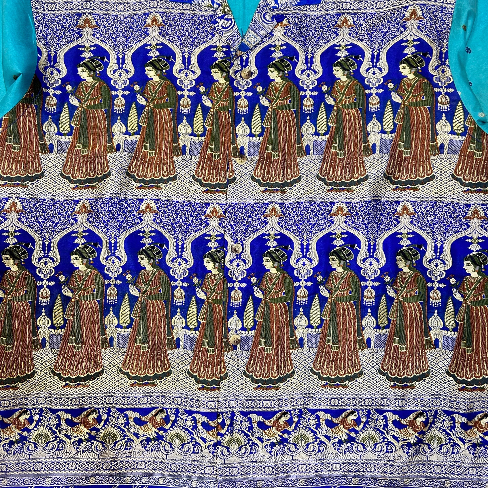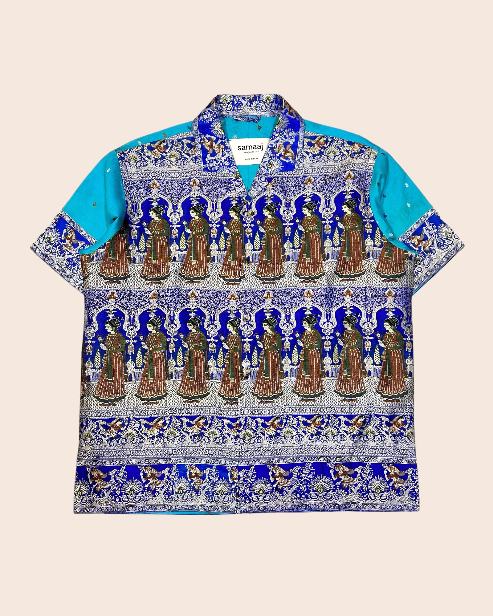 Vintage silk shirt made out of 1990s vintage deadstock saree. This saree is handwoven with Baluchari technique by the skilled weavers and embroiders of West Bengal, India.