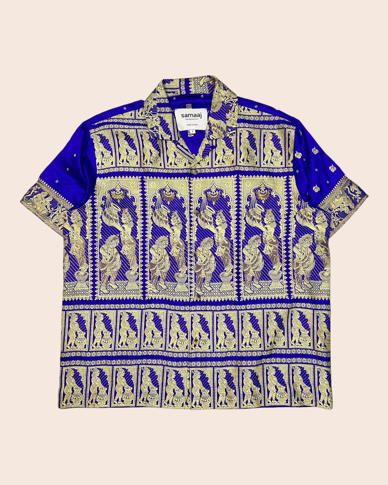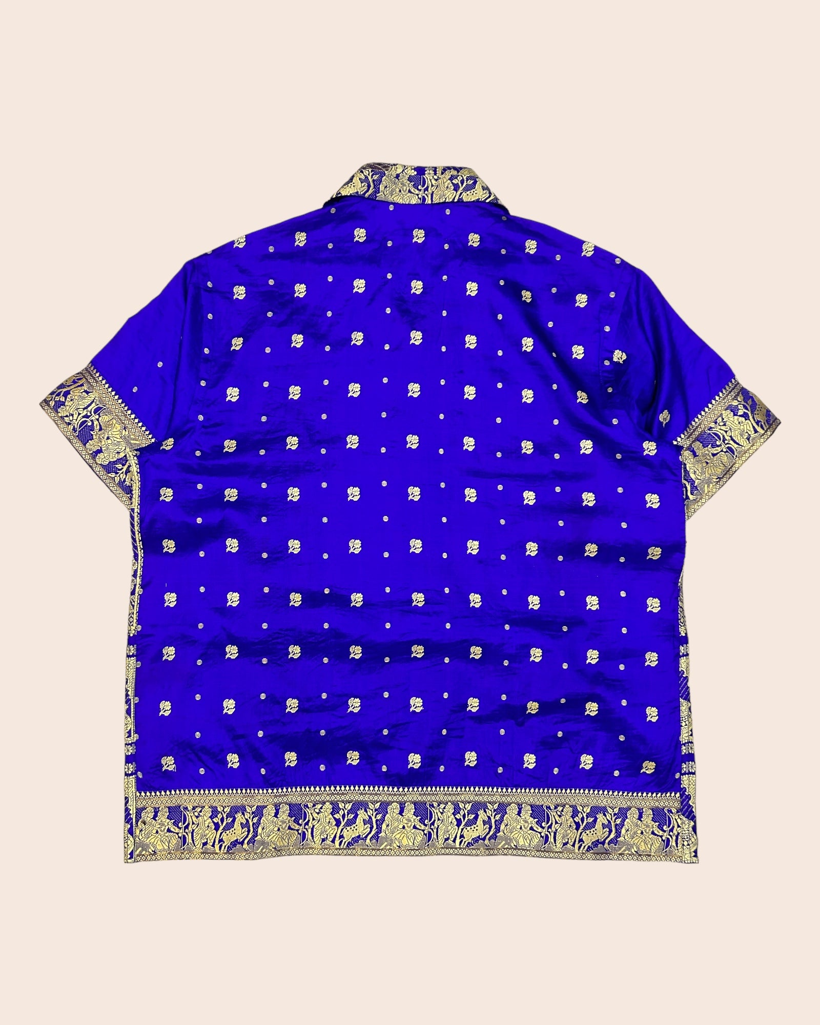 Vintage silk shirt made out of 1990s vintage deadstock saree. This saree is handwoven with Baluchari technique by the skilled weavers and embroiders of West Bengal, India.