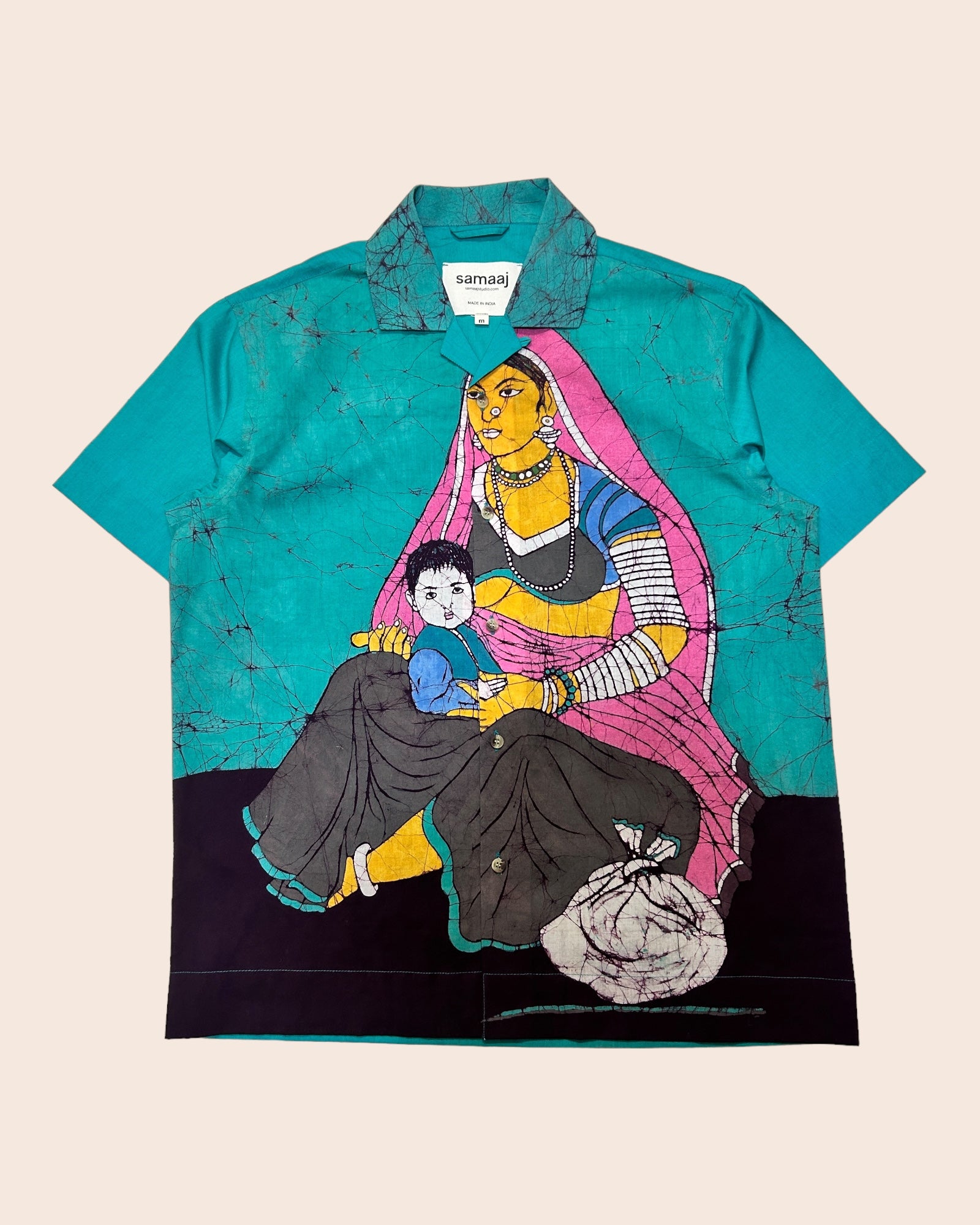 Art depicts women carrying a child on her lap. Batik is a process of using melted wax as a resist on fabric. The wax may be painted on a white or coloured fabric using a canting or brush or it may be stamped onto the fabric using a copper stamp dipped in melted wax.