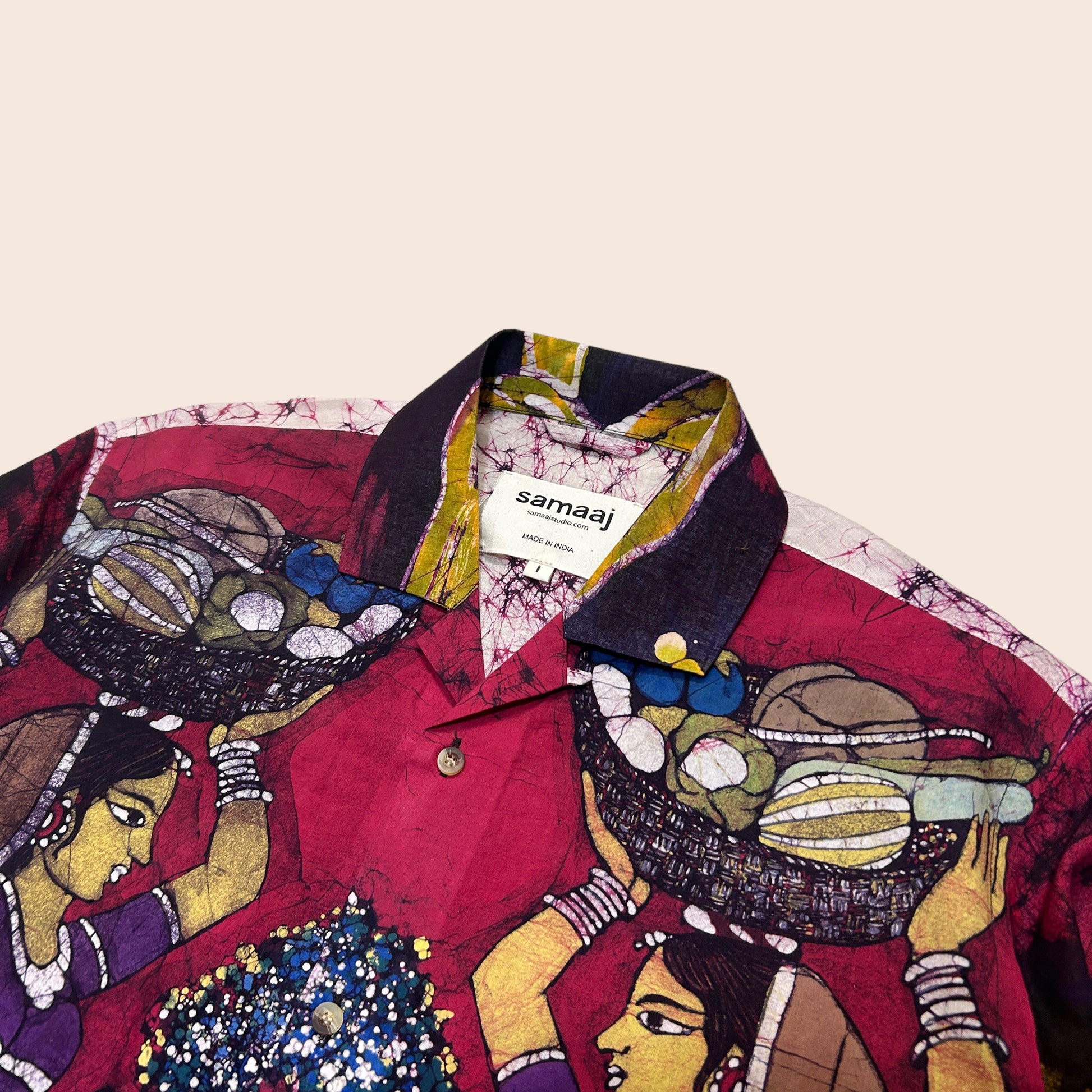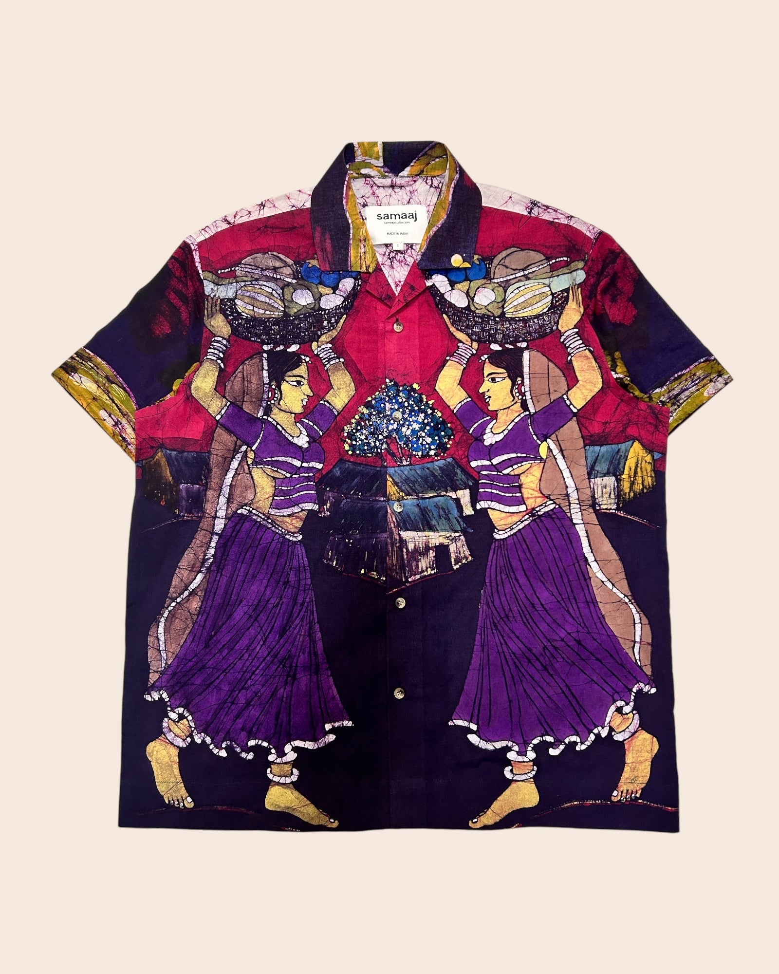 Art depicts women carrying fruits. Batik is a process of using melted wax as a resist on fabric. The wax may be painted on a white or coloured fabric using a canting or brush or it may be stamped onto the fabric using a copper stamp dipped in melted wax.