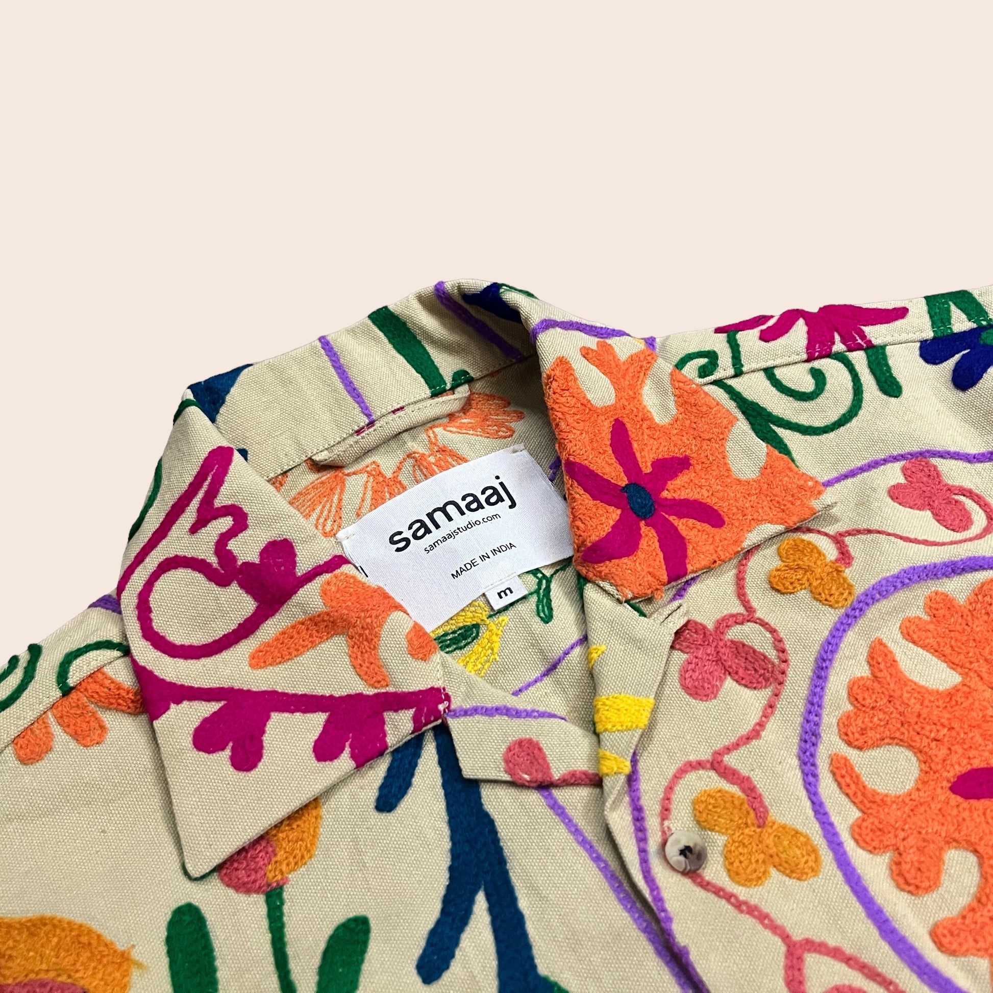 Suzani hand embroidered shirt made from handwoven cotton and hand embroidered with Suzani technique native to Uzbekistan. This particular shirt is made from vintage bed cover from 1980s.