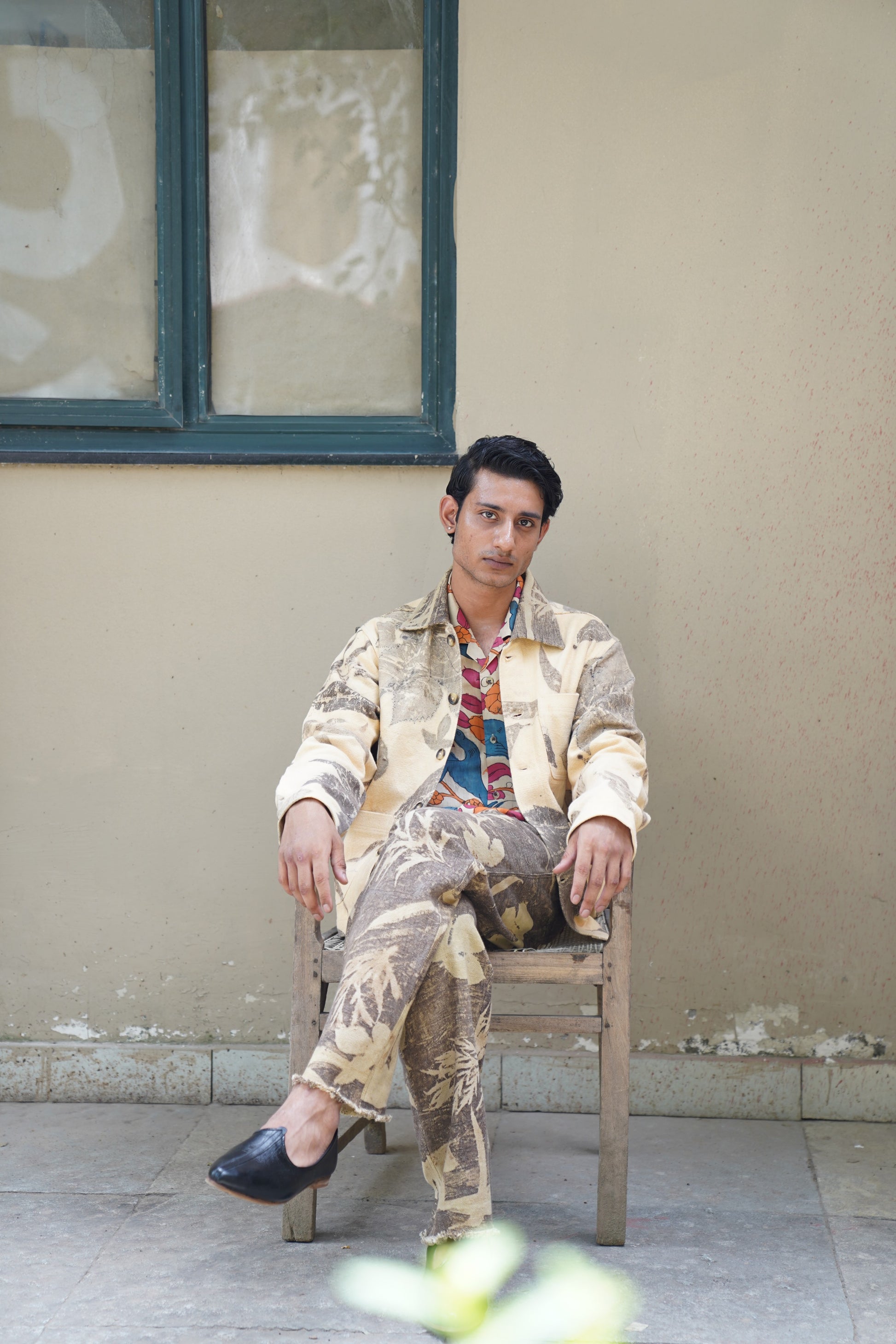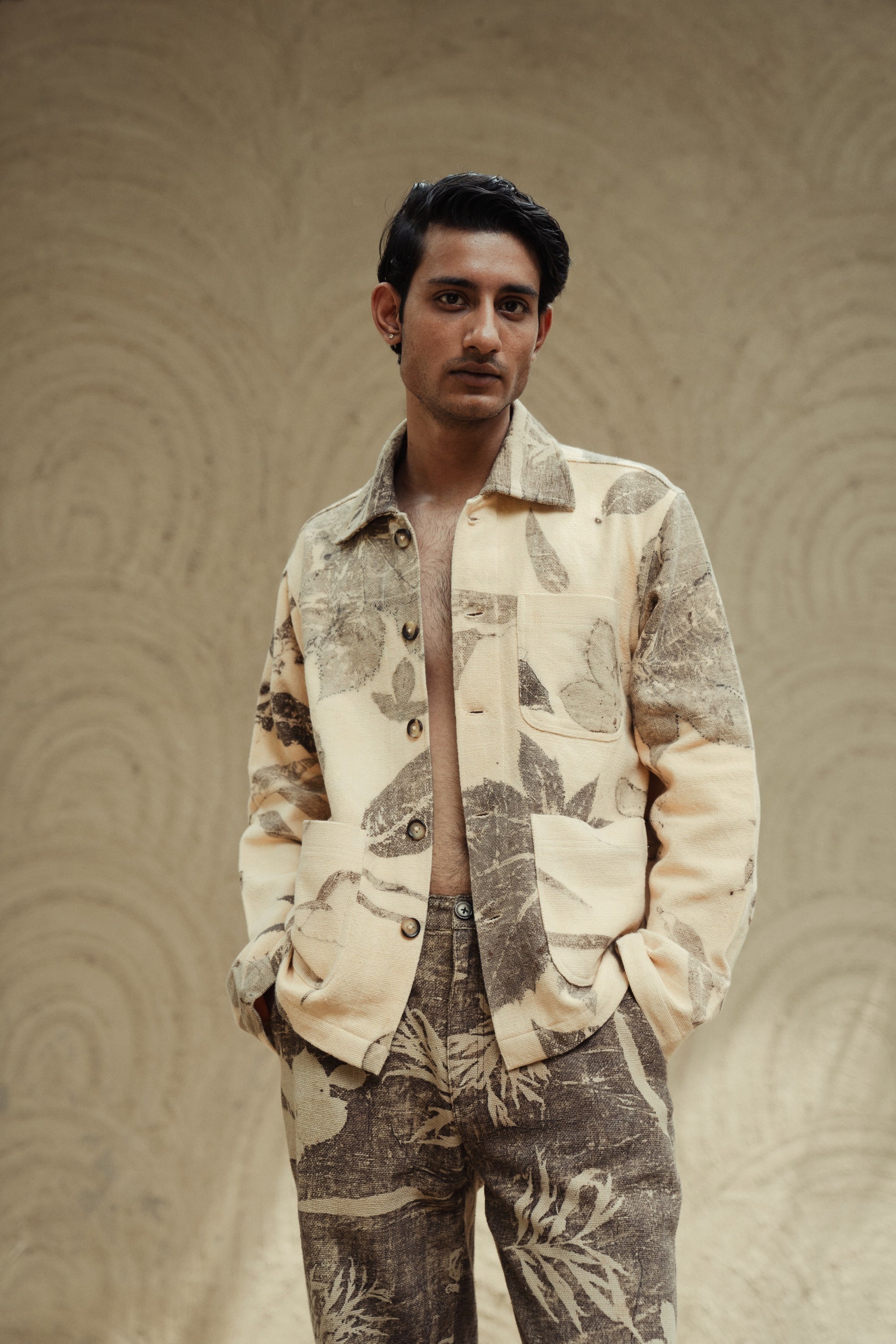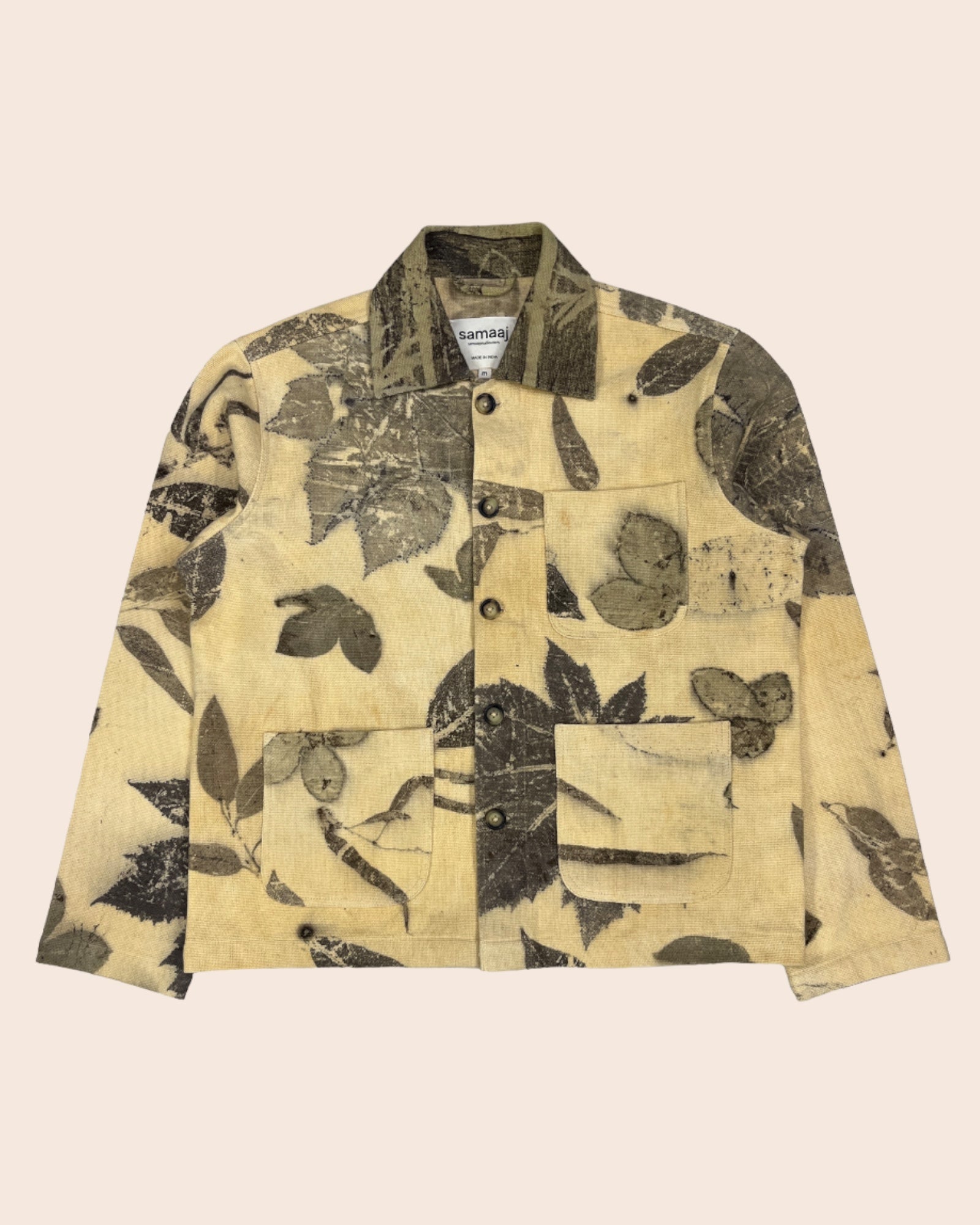 Workwear jacket made from handspun and handwoven cotton (khadi) and naturally dyed with Myrobalan and turmeric (Haldi), eco printed with leaves. It's a timeless piece that's designed with the earth and sustainability in mind, crafted with a level of artisanal craftsmanship that ensures it'll never go out of style.
