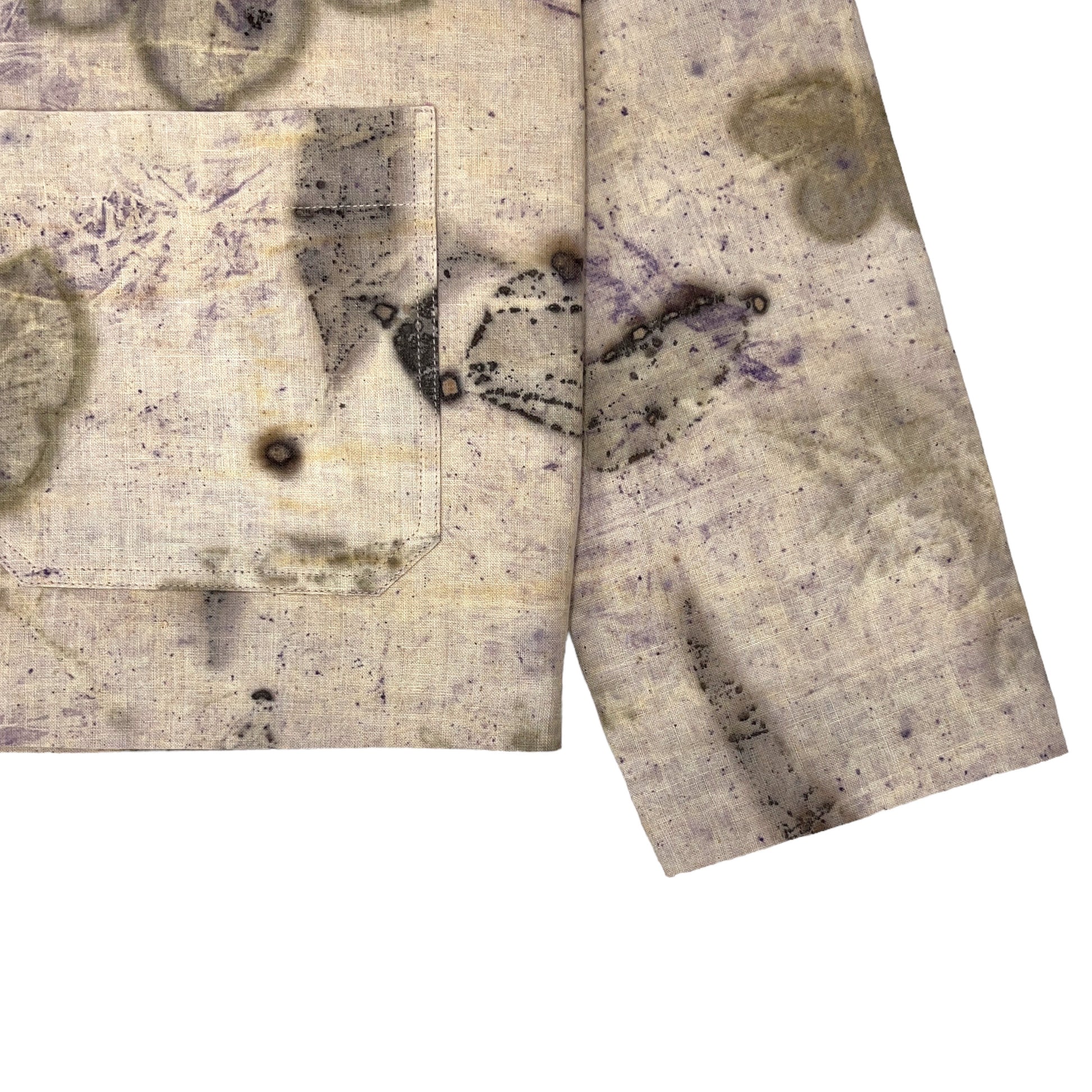 Workwear jacket made from handspun and handwoven cotton (khadi) and naturally dyed with Indian Blueberry (Jamun) and eco printed with leaves.