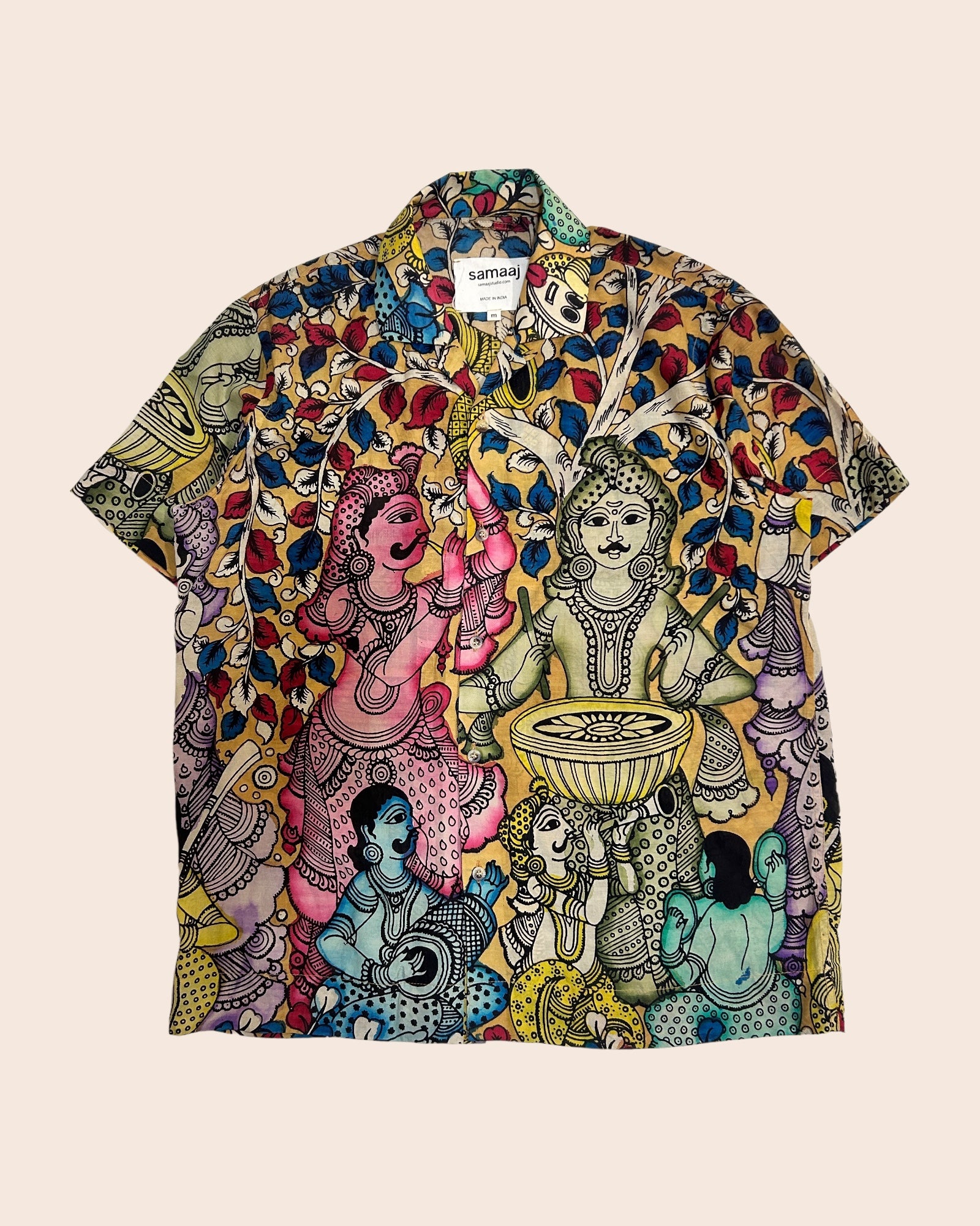 Yellow shirt hand painted by the kalamkari technique native to Andhra Pradesh region of India. Naturally dyed with indigo, myrobalan and alum.