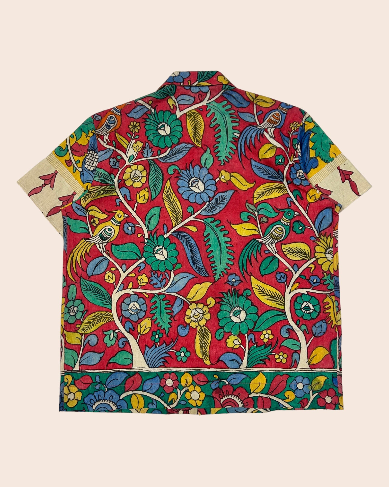 Yellow shirt hand block printed and hand painted by the kalamkari technique native to Andhra Pradesh region of India. Naturally dyed with indigo, myrobalan and alum.
