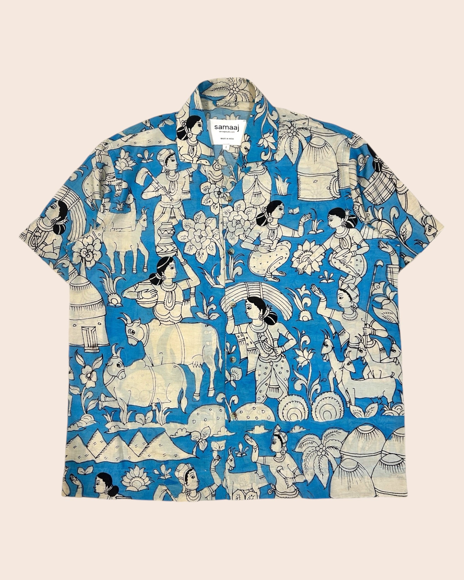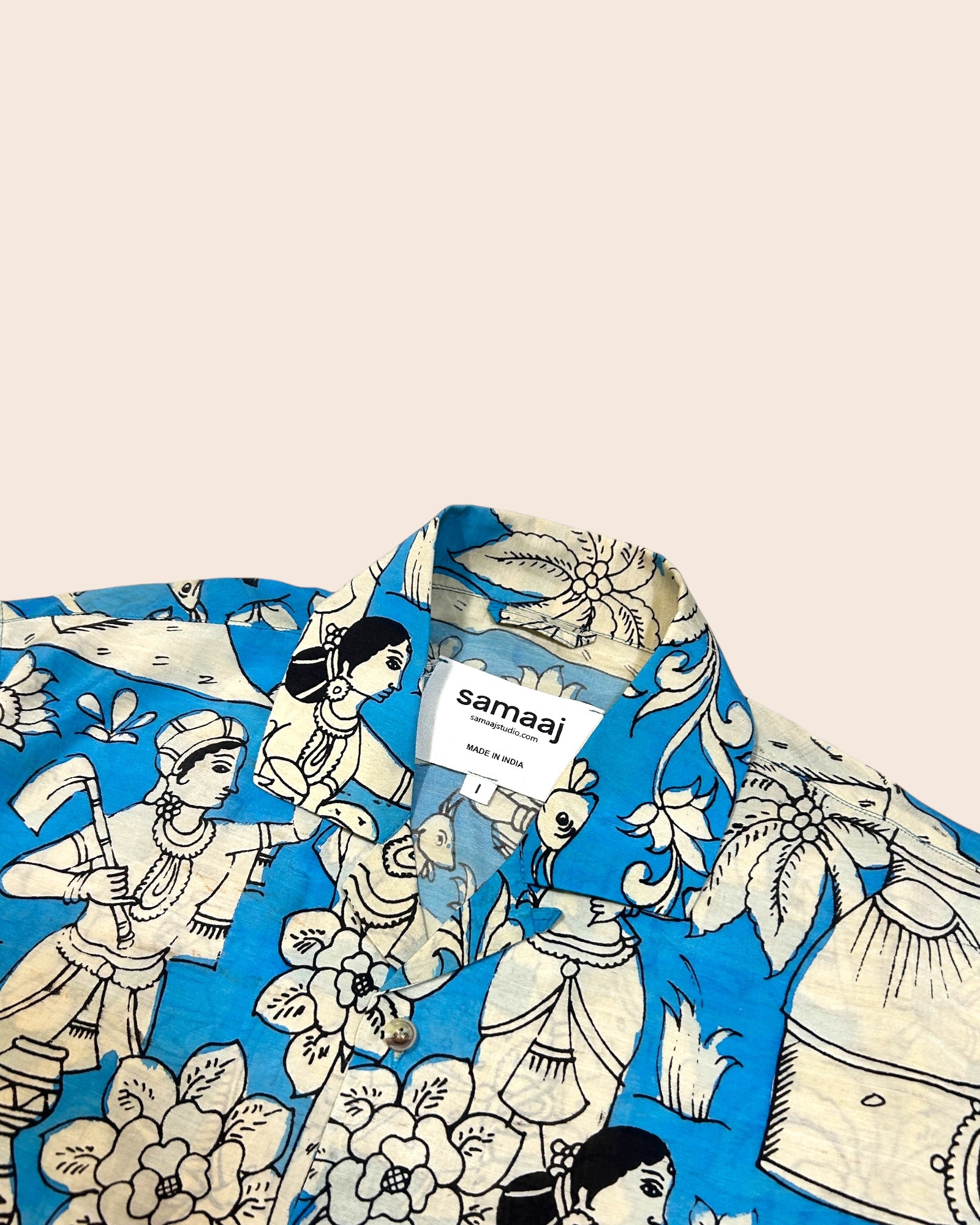 Blue shirt hand painted by the kalamkari technique native to Andhra Pradesh region of India. Naturally dyed with indigo, myrobalan and alum.