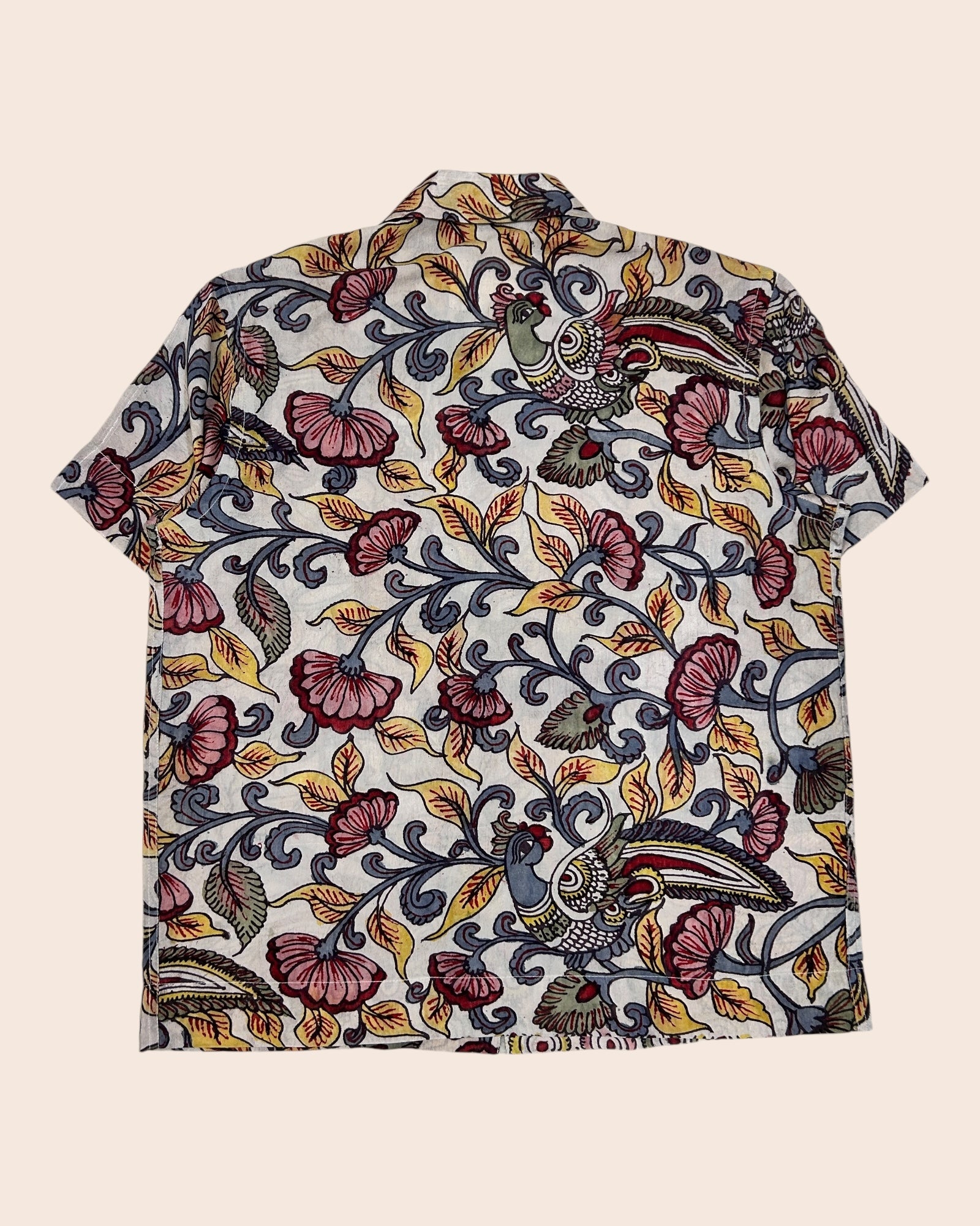 Yellow shirt hand block printed and hand painted by the kalamkari technique native to Andhra Pradesh region of India. Naturally dyed with indigo, myrobalan and alum.