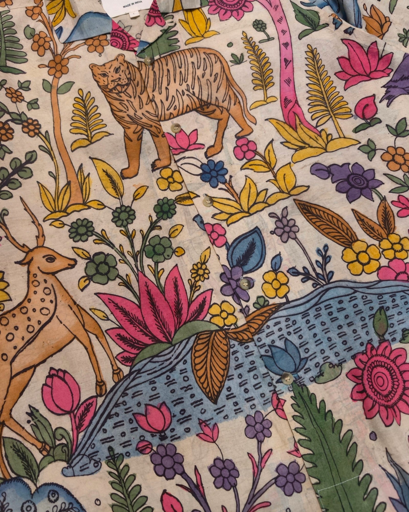 White shirt hand painted by the kalamkari technique native to Andhra Pradesh region of India. Naturally dyed with indigo, myrobalan and alum.
