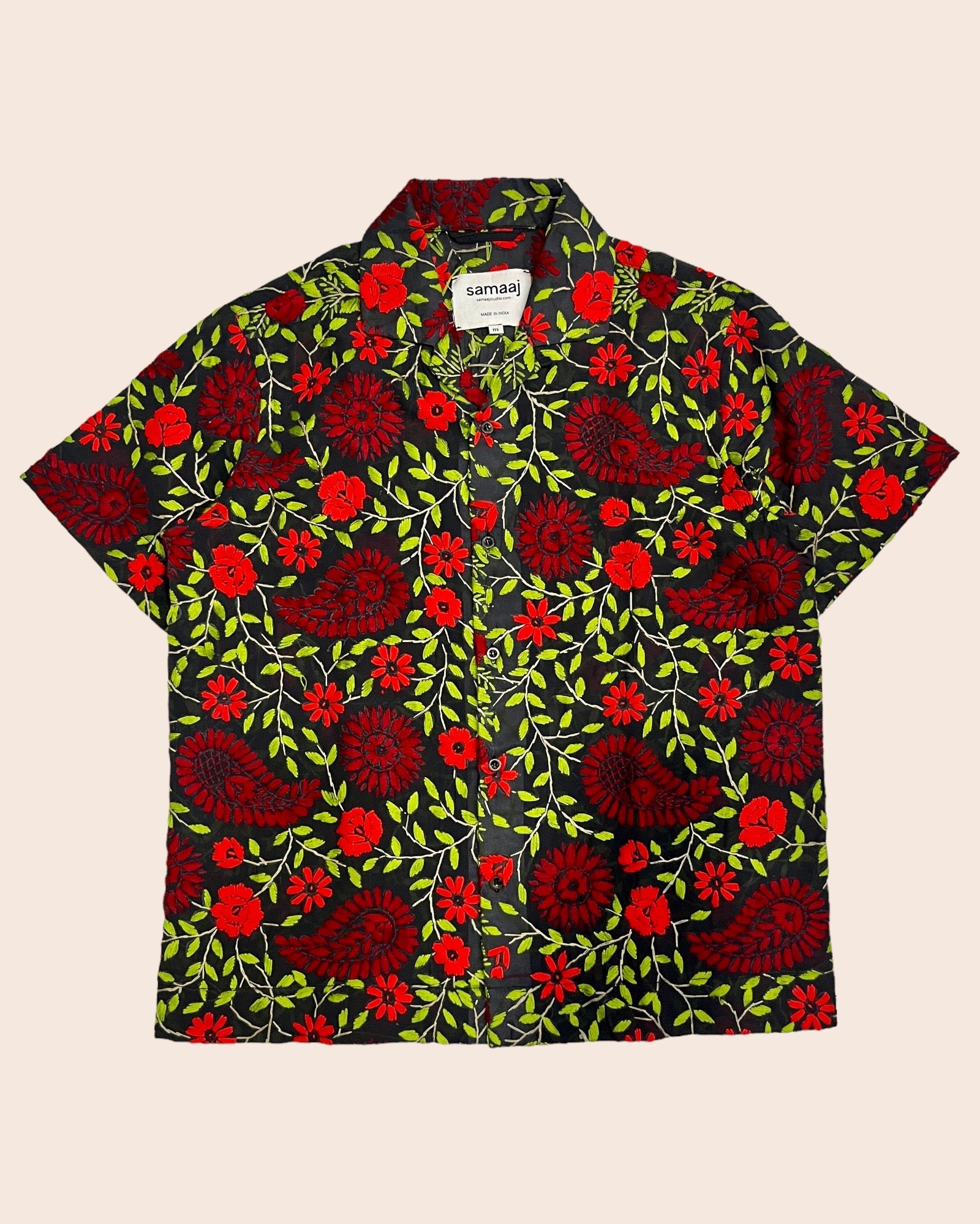1/1 Vintage silk shirt made out of 1990s vintage dead-stock saree. This saree is hand block printed and further hand embroidered with NAKSHI KANTHA technique by the weavers of West Bengal, India.