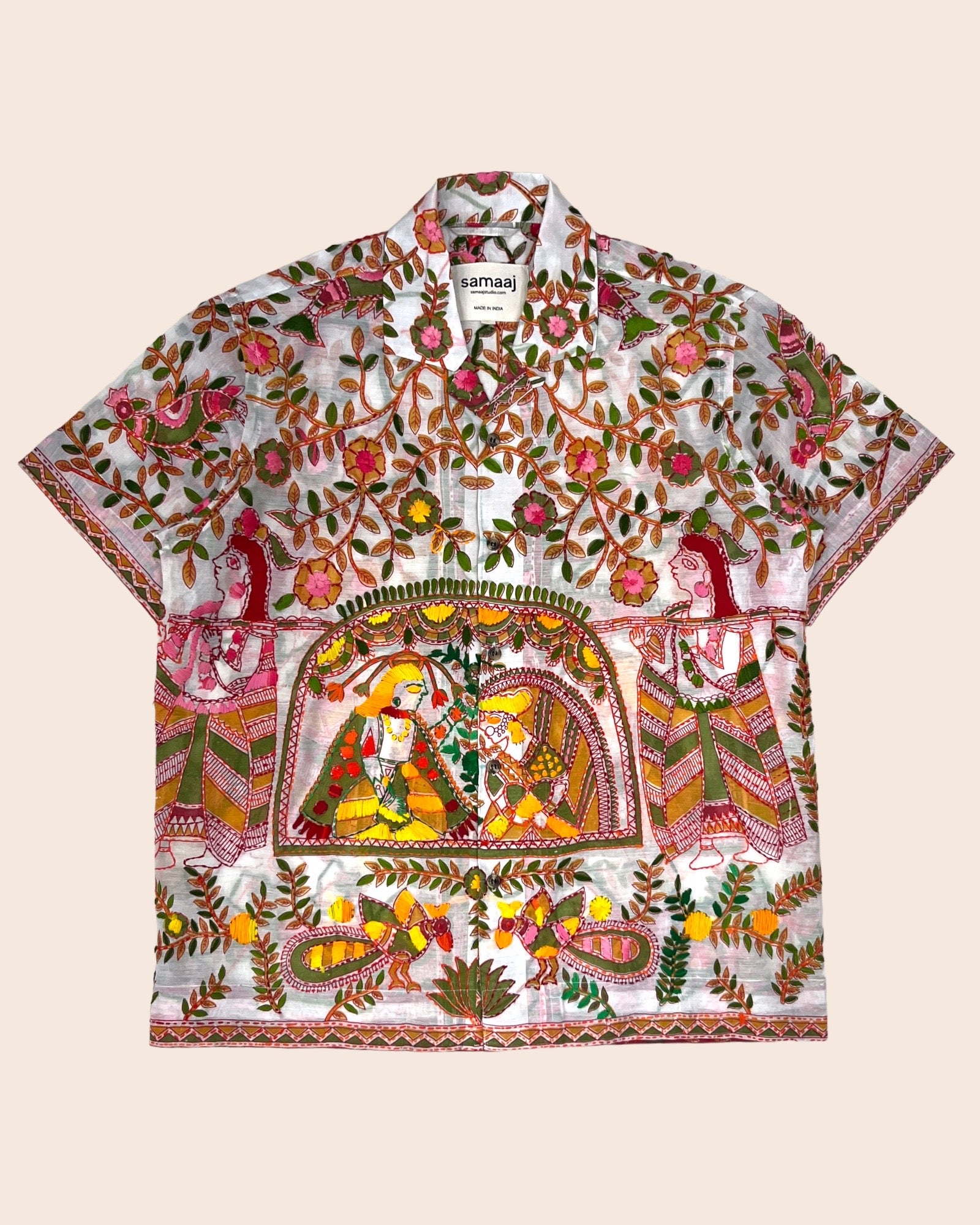 1/1 Vintage silk shirt made out of 1990s vintage deadstock saree. This saree is hand block printed and further hand embroidered with NAKSHI KANTHA technique by the weavers and embroiders of West Bengal, India.