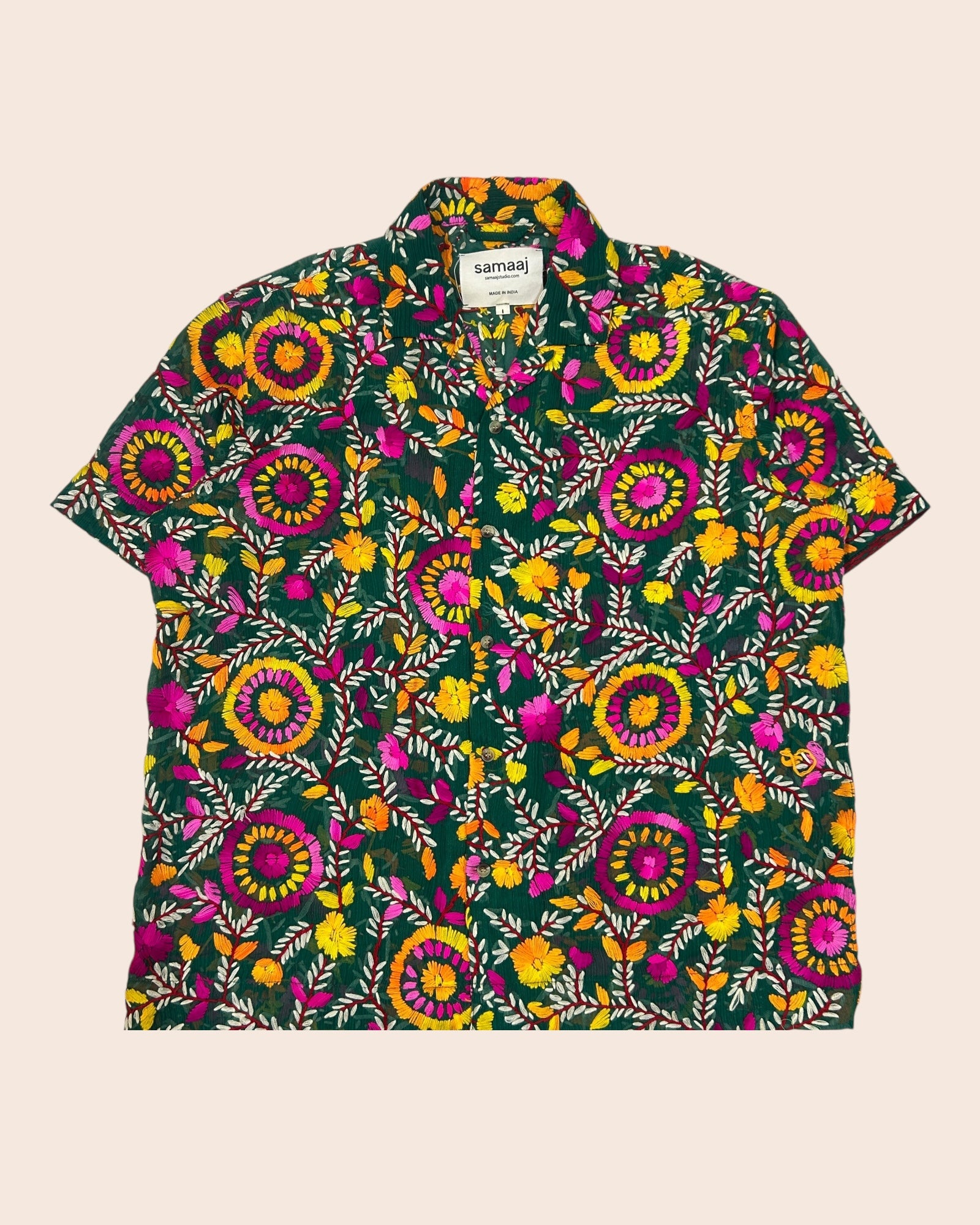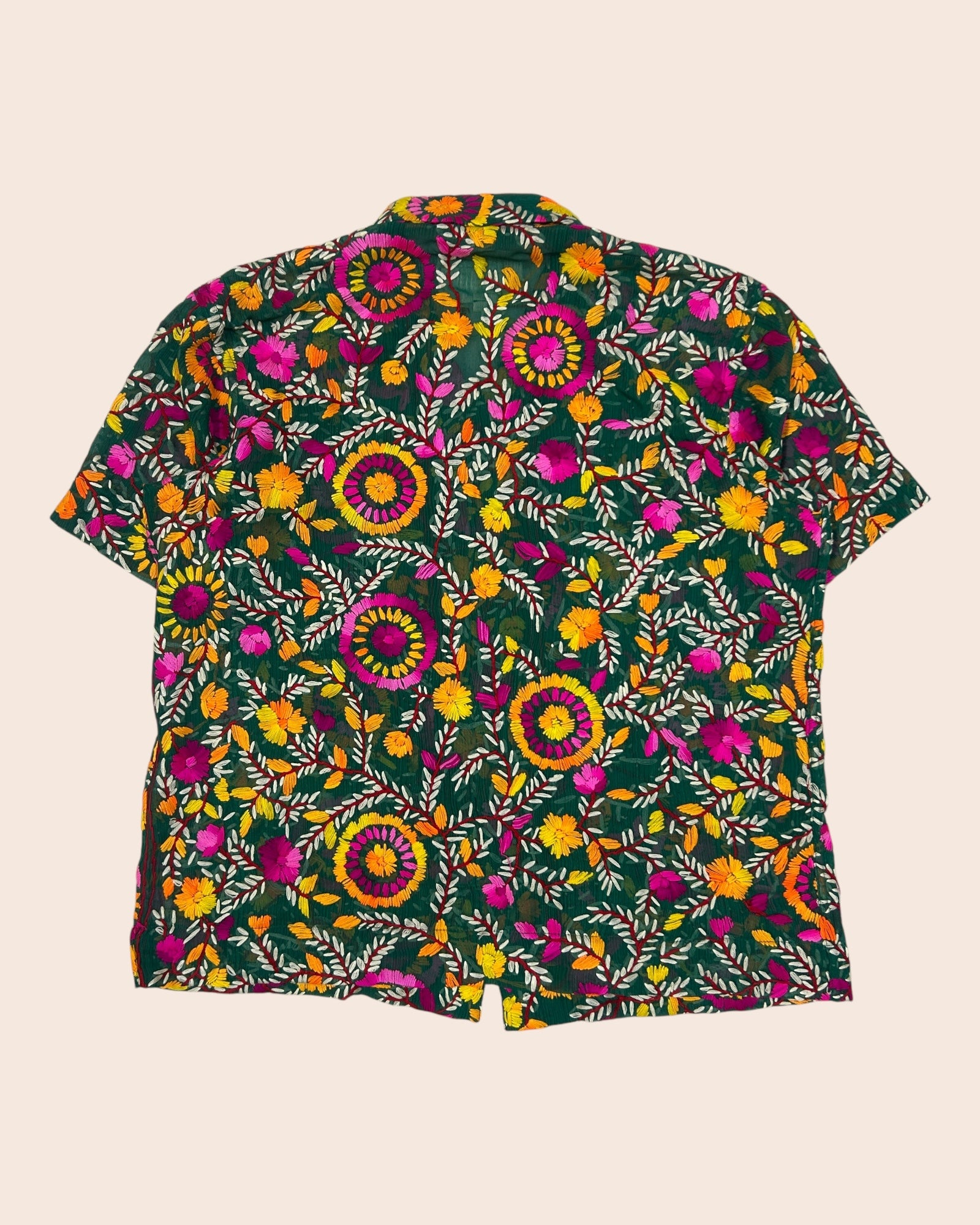 Vintage silk shirt made out of 1990s vintage deadstock saree. This saree is hand block printed and further hand embroidered with Phulkari technique by the weavers and embroiders of Punjab, India. The fabric offers a light, airy feel with a slightly transparent quality.