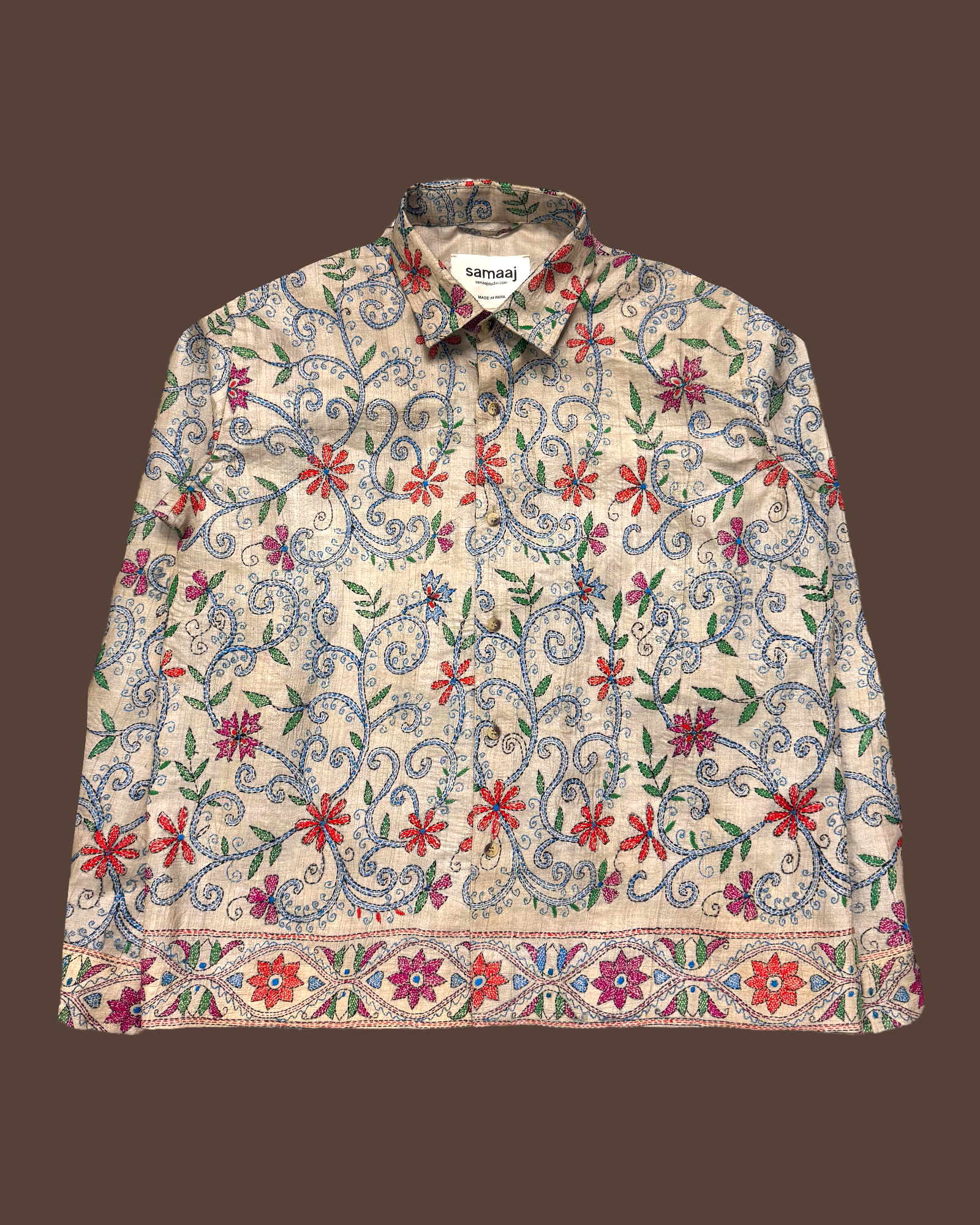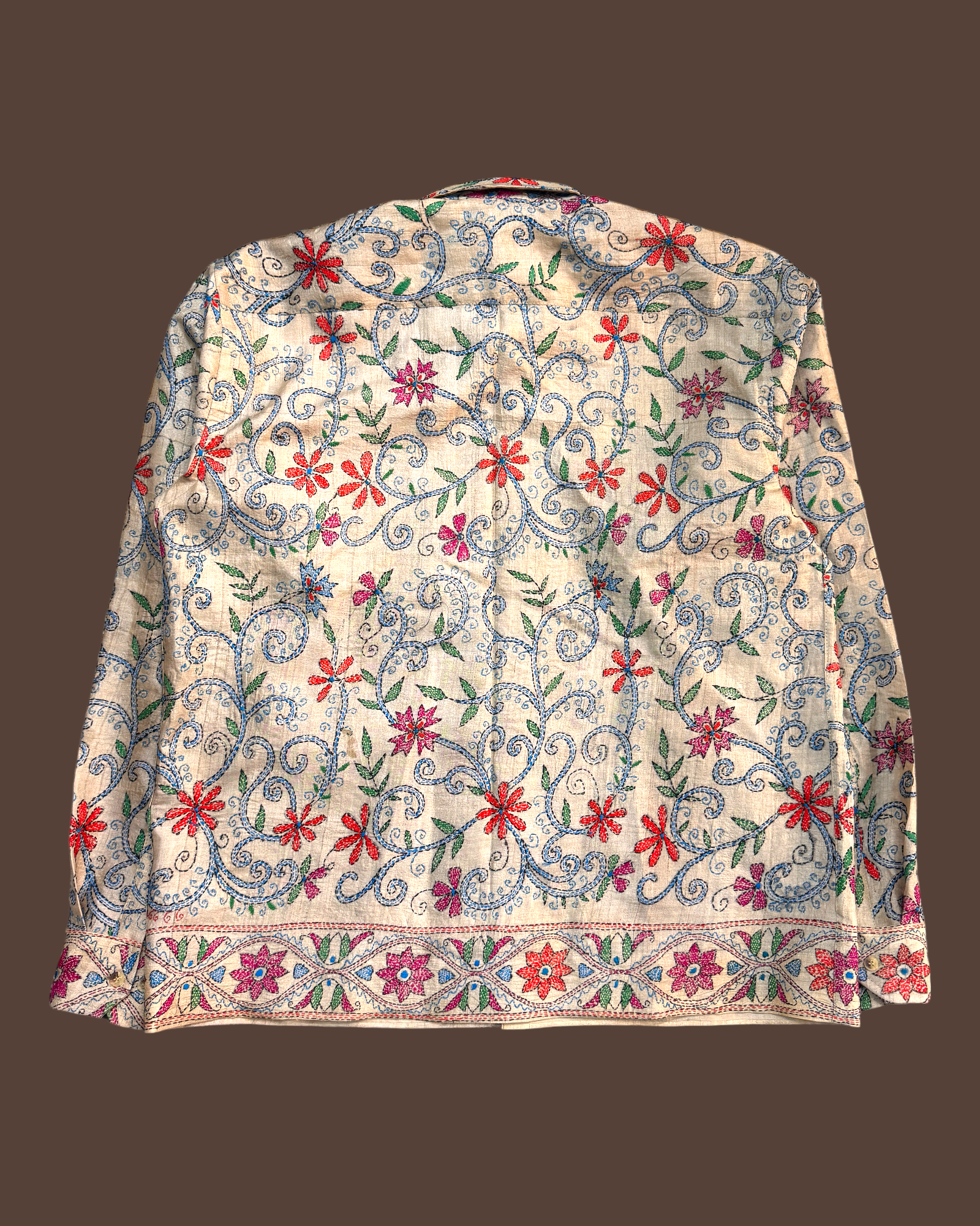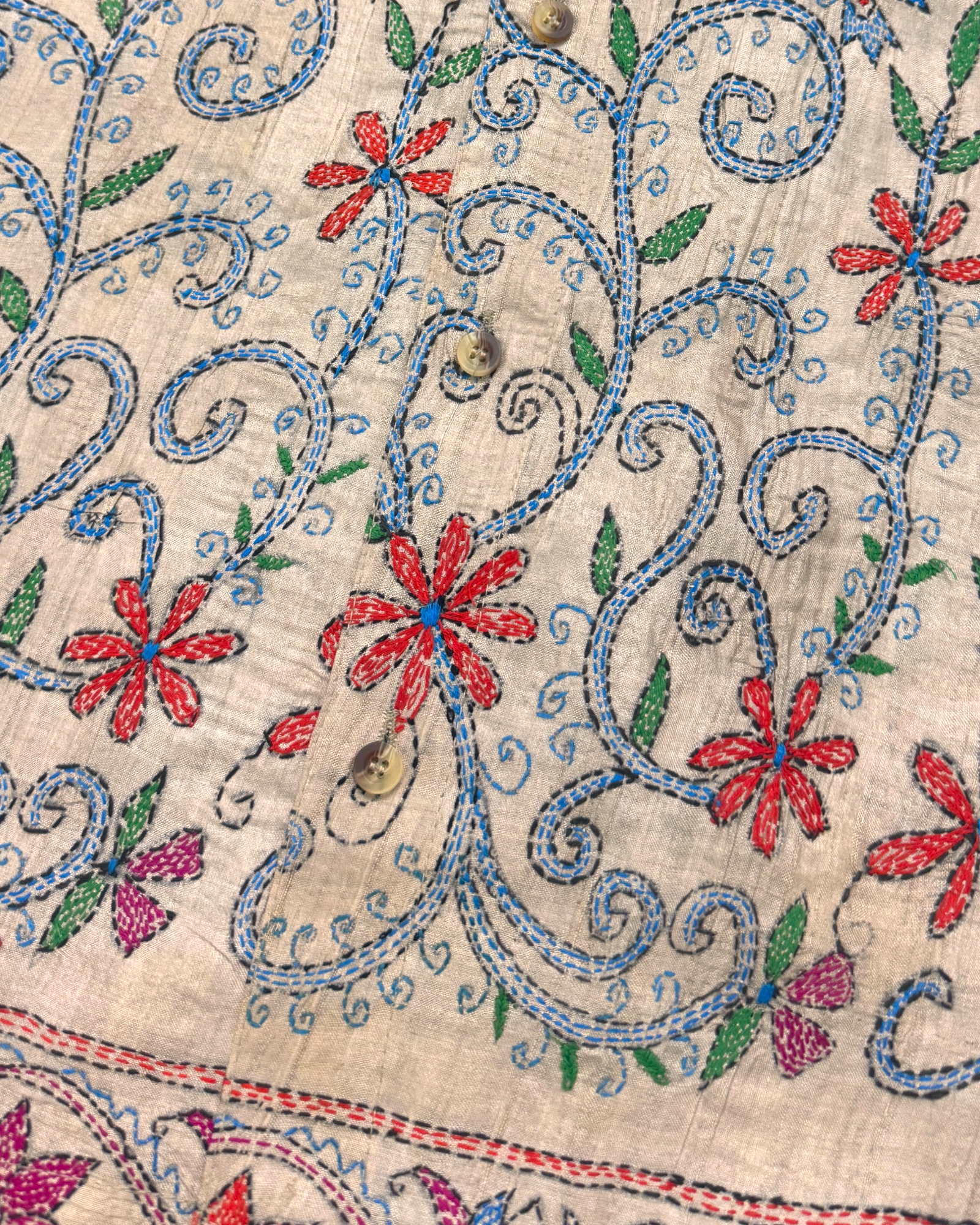 Vintage silk shirt made out of 1990s vintage deadstock saree. This saree is hand block printed and further hand embroidered with Kantha technique by the weavers and embroiders of West Bengal, India.