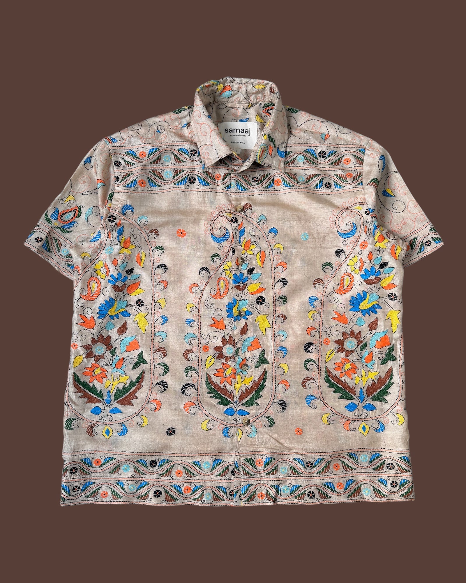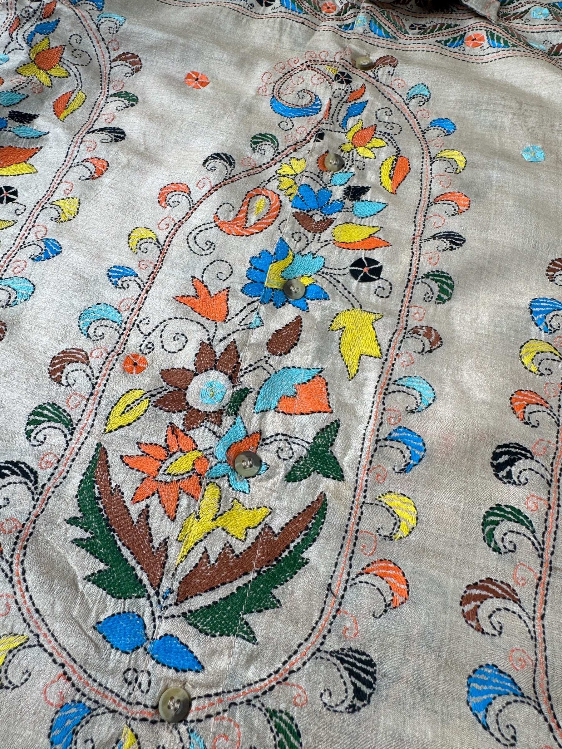 Vintage silk shirt made out of 1990s vintage deadstock saree. This saree is hand block printed and further hand embroidered with NAKSHI KANTHA technique by the weavers and embroiders of West Bengal, India.