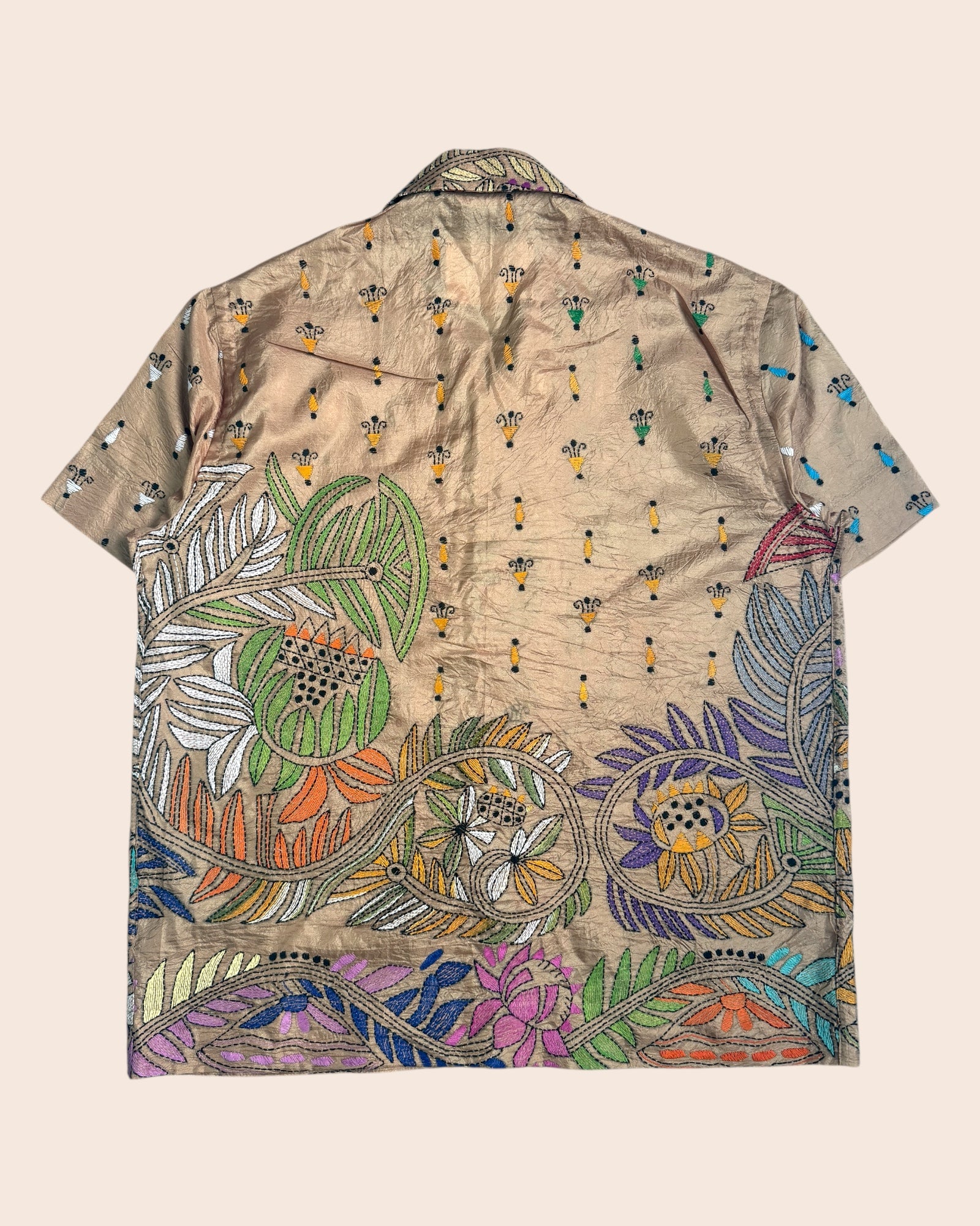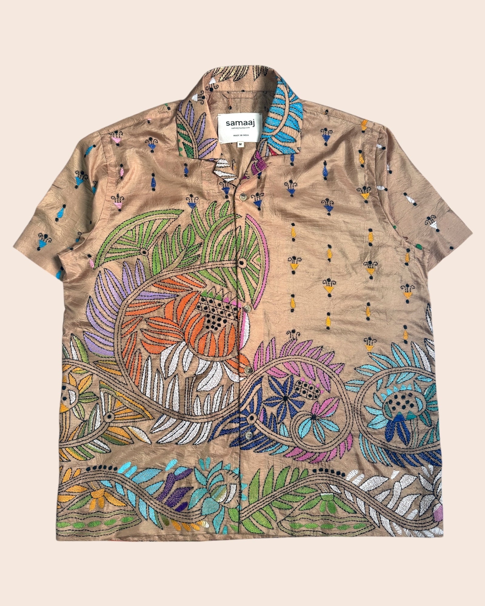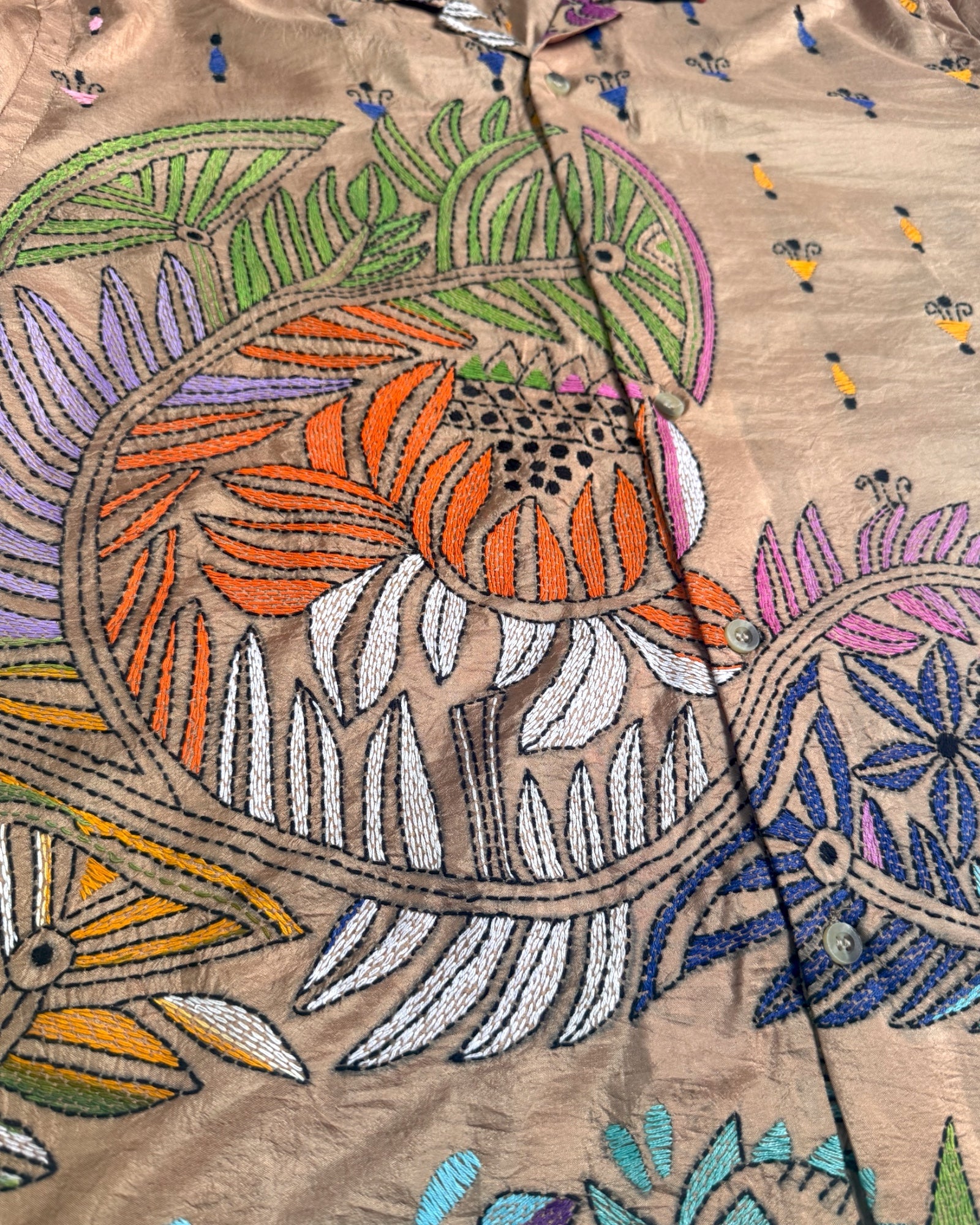 Vintage silk shirt made out of 1990s vintage deadstock saree. This saree is hand block printed and further hand embroidered with NAKSHI KANTHA technique by the weavers and embroiders of West Bengal, India.