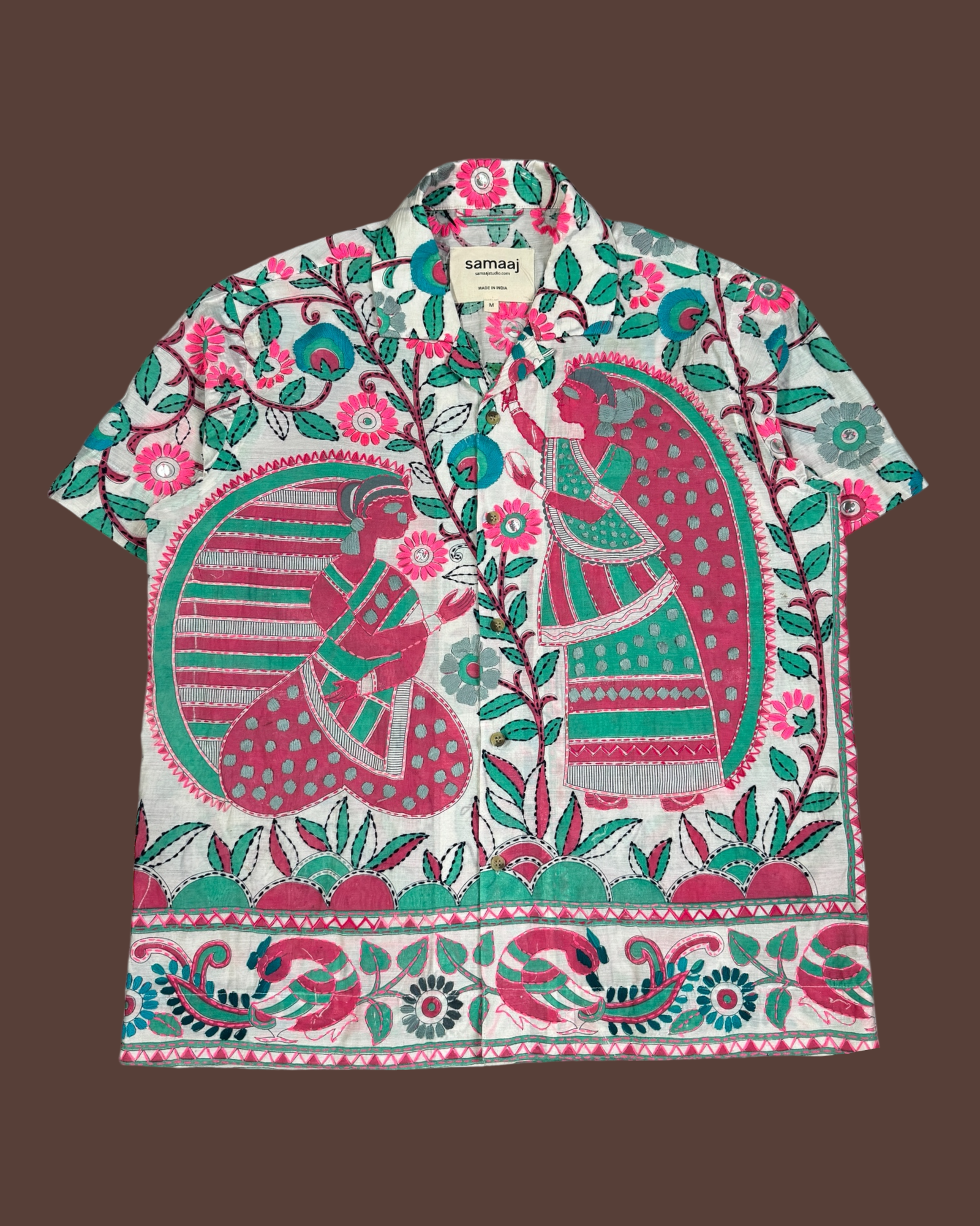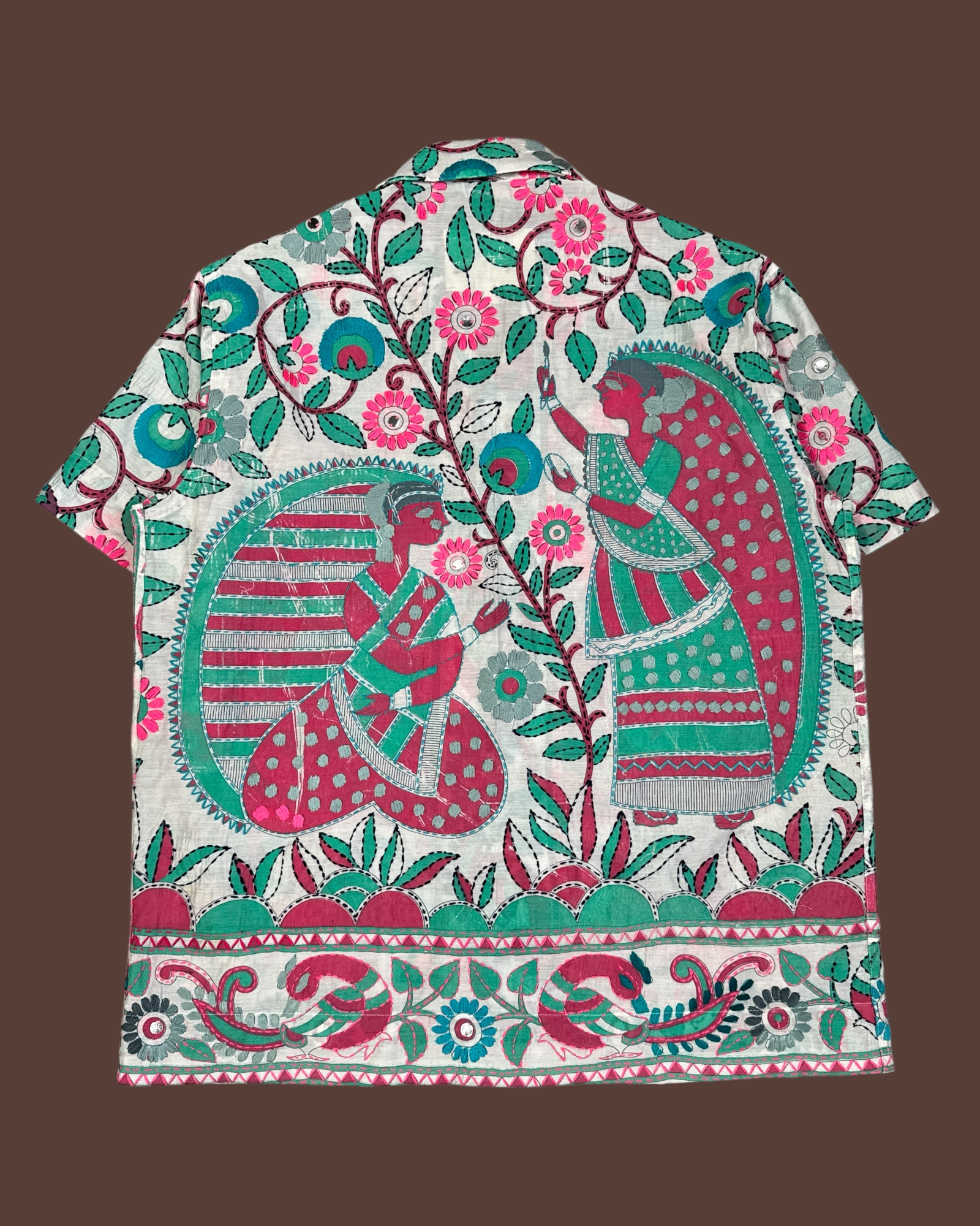 Vintage silk shirt made out of 1990s vintage deadstock saree. This saree is hand block printed and further hand embroidered with NAKSHI KANTHA technique by the weavers and embroiders of West Bengal, India.