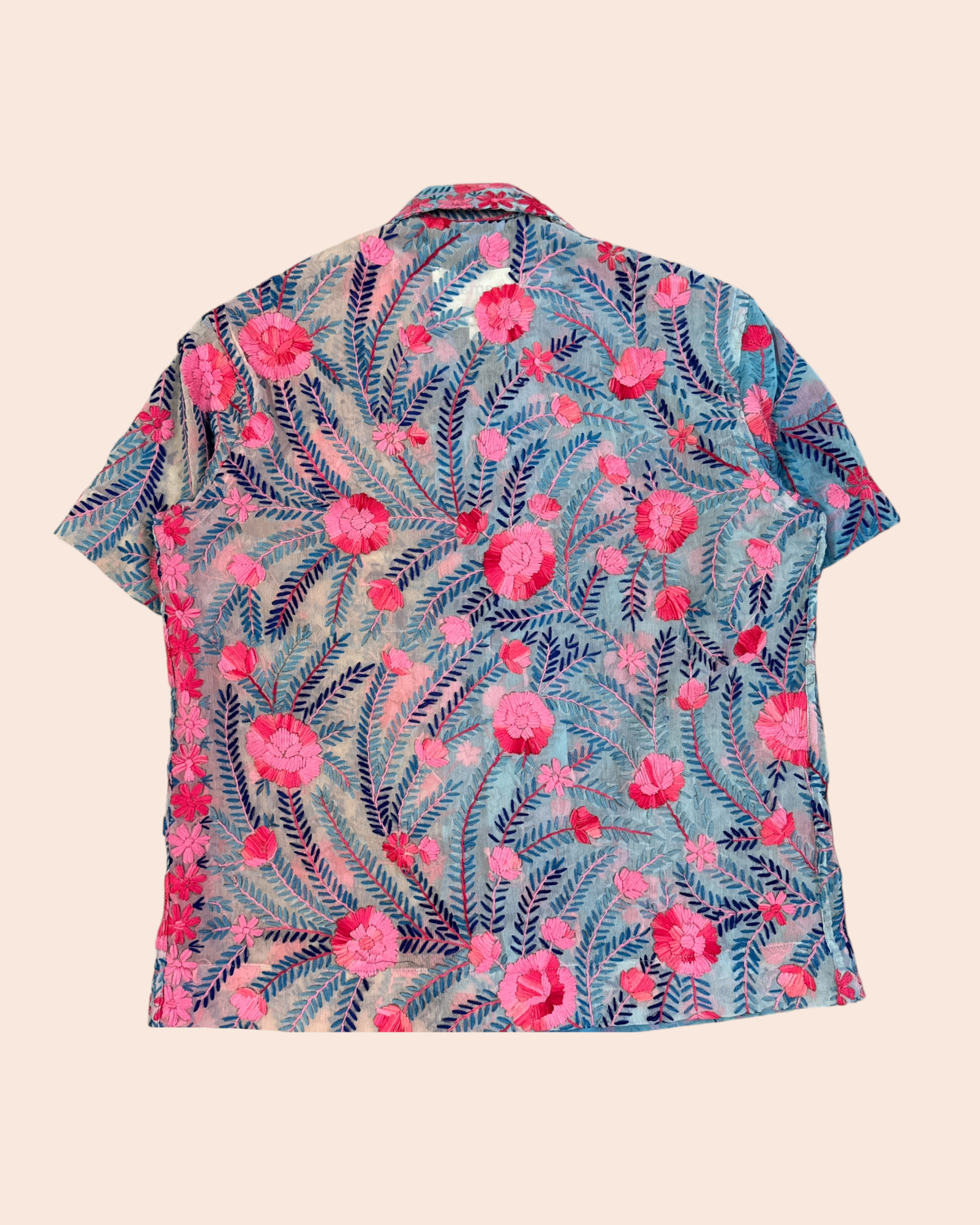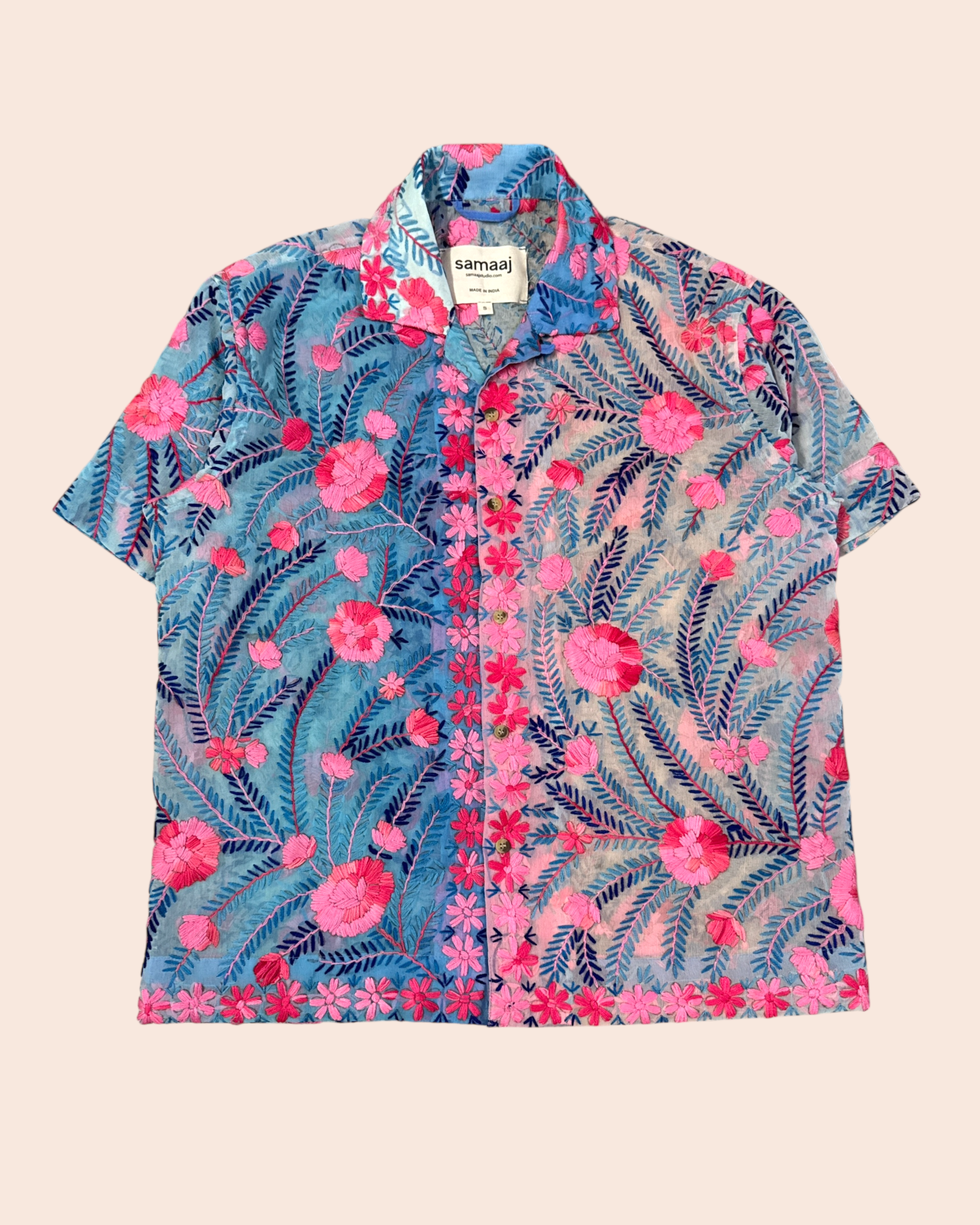 Vintage silk shirt made out of 1990s vintage deadstock saree. This saree is hand block printed and further hand embroidered with NAKSHI KANTHA technique by the weavers and embroiders of West Bengal, India.