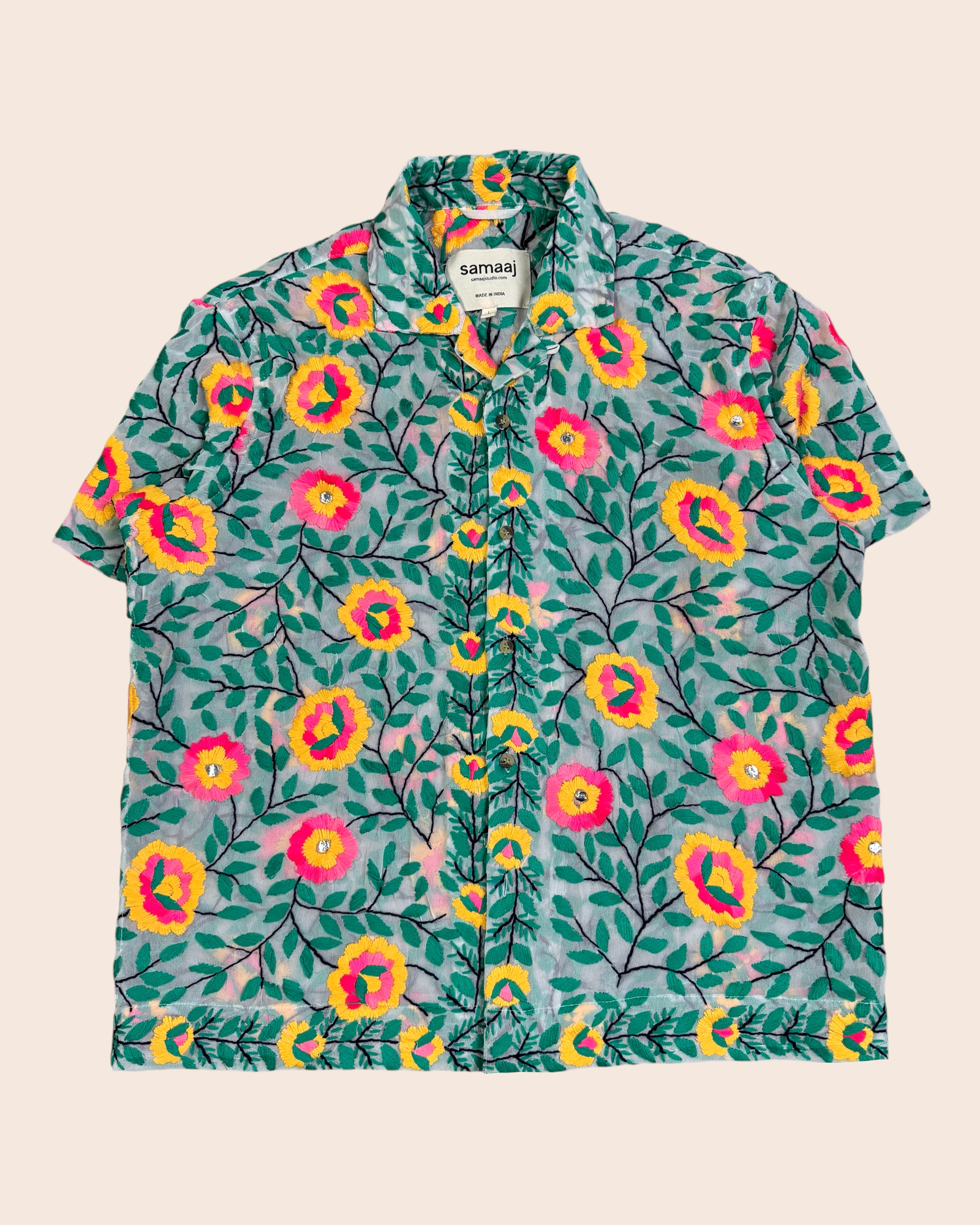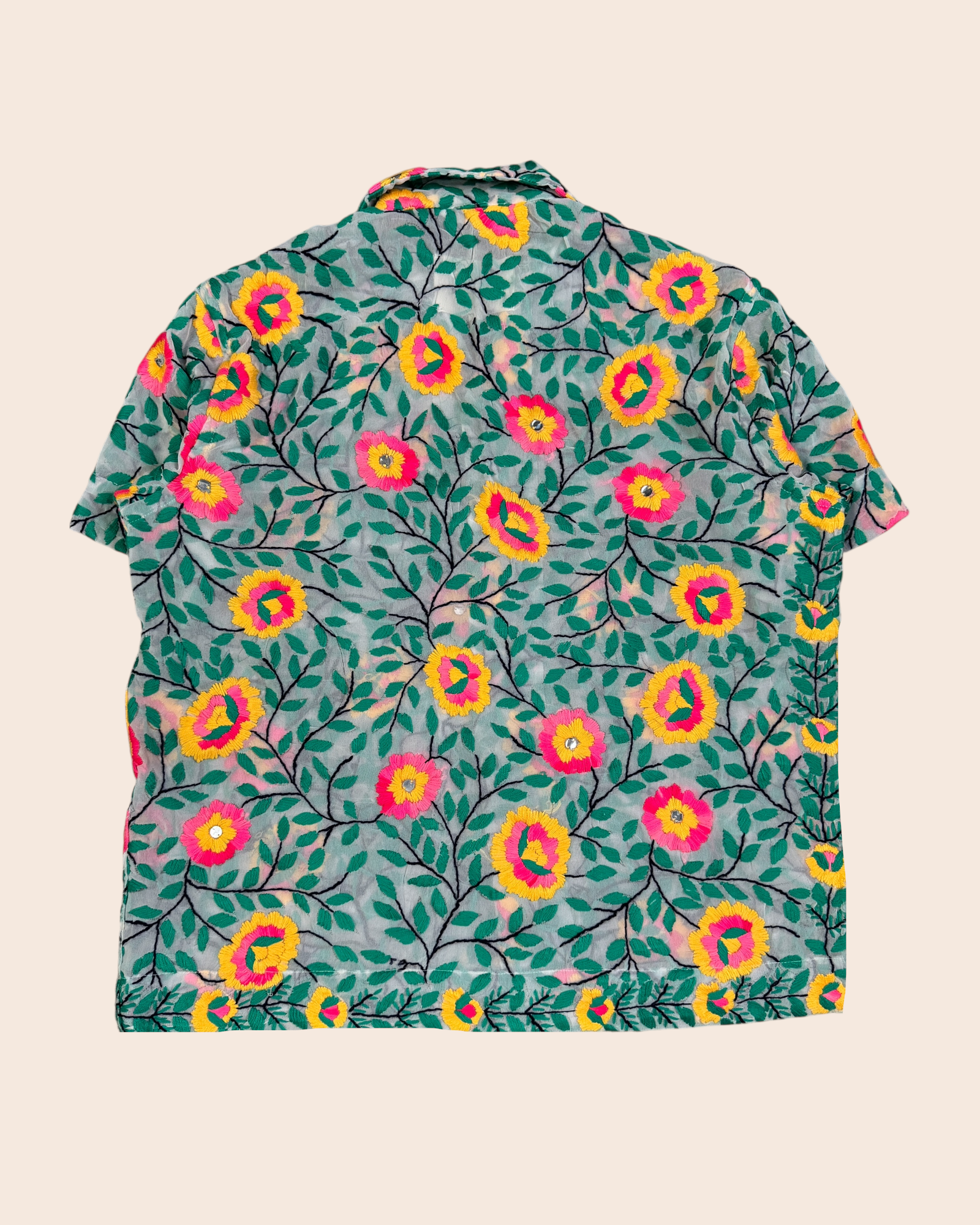 Vintage silk shirt made out of 1990s vintage deadstock saree. This saree is hand block printed and further hand embroidered with NAKSHI KANTHA technique by the weavers and embroiders of West Bengal, India.
