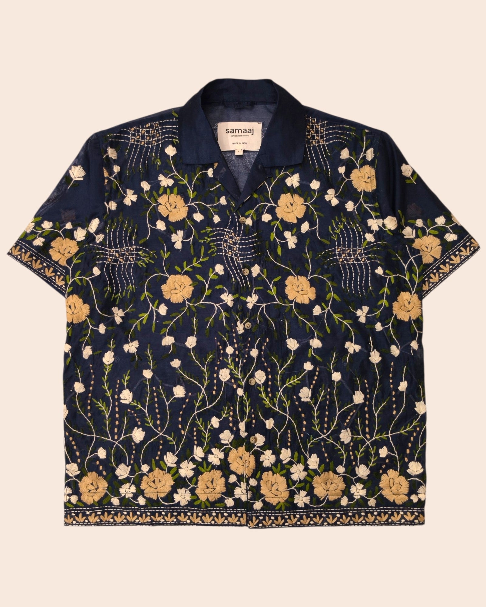 Vintage silk shirt made out of 1990s vintage deadstock saree. This saree is hand block printed and further hand embroidered with NAKSHI KANTHA technique by the weavers and embroiders of West Bengal, India.