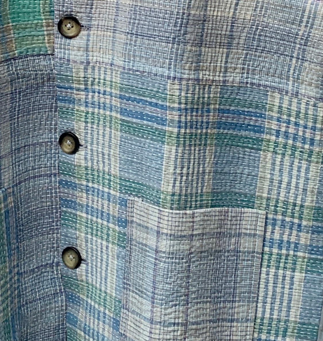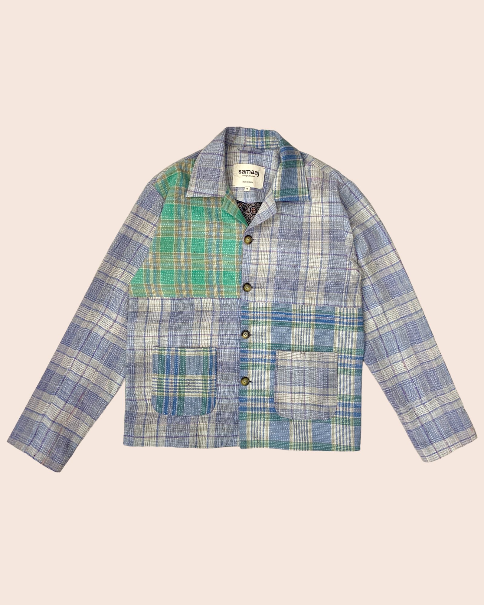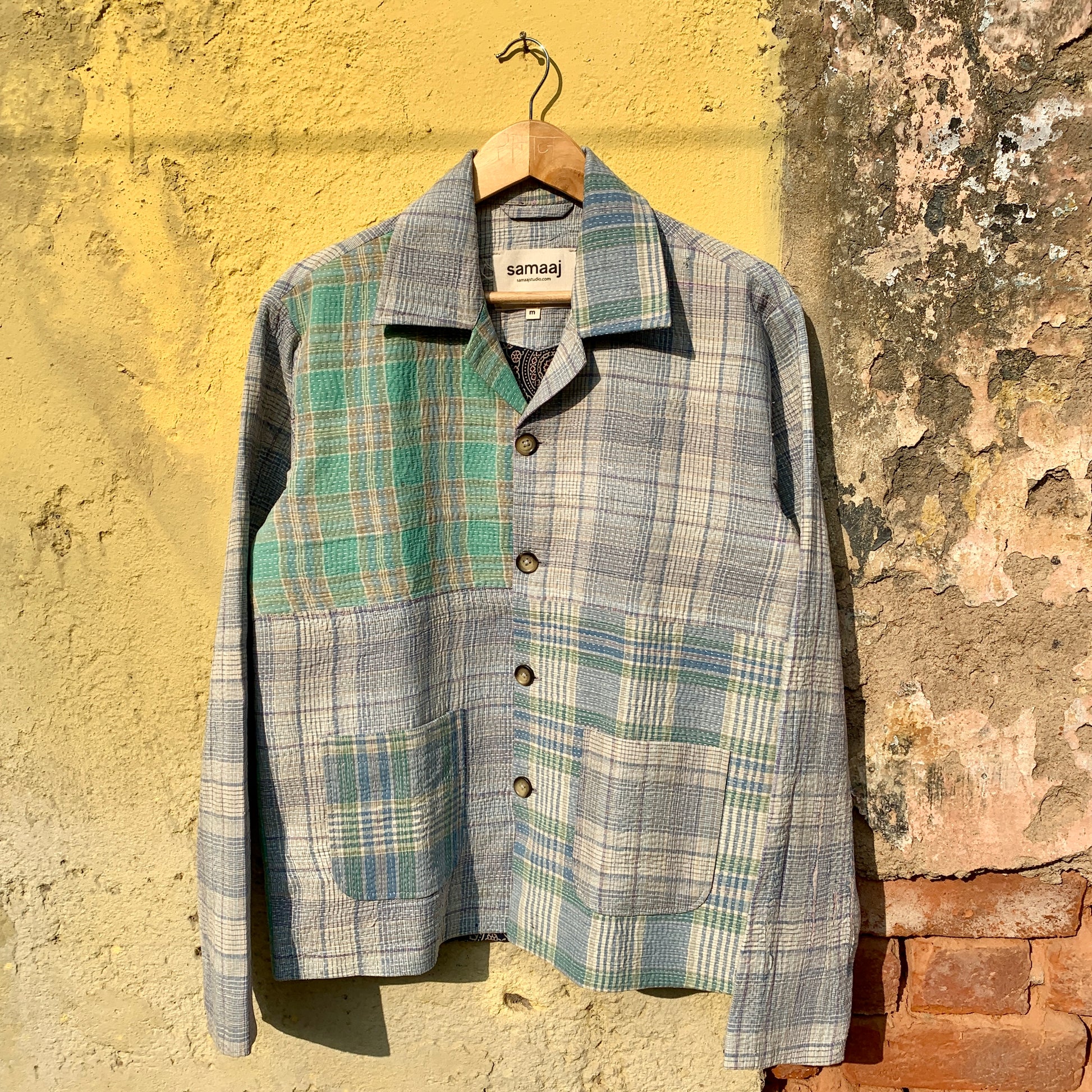 Antique handwoven kitchen towels patched together to form a workwear jacket. Lined with naturally dyed ajrakh block printed bemberg. Finished with horn buttons.