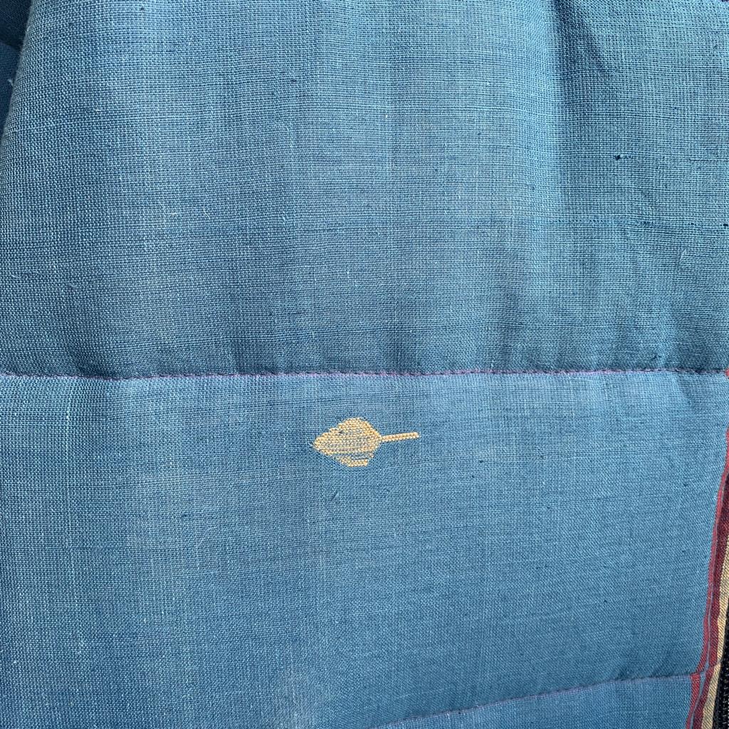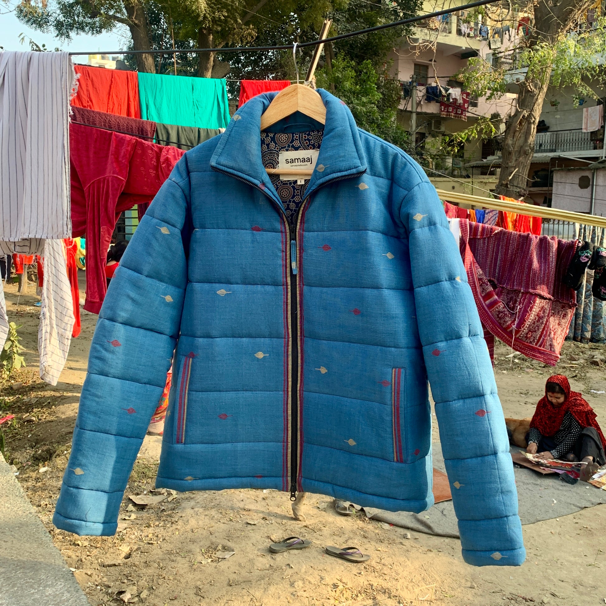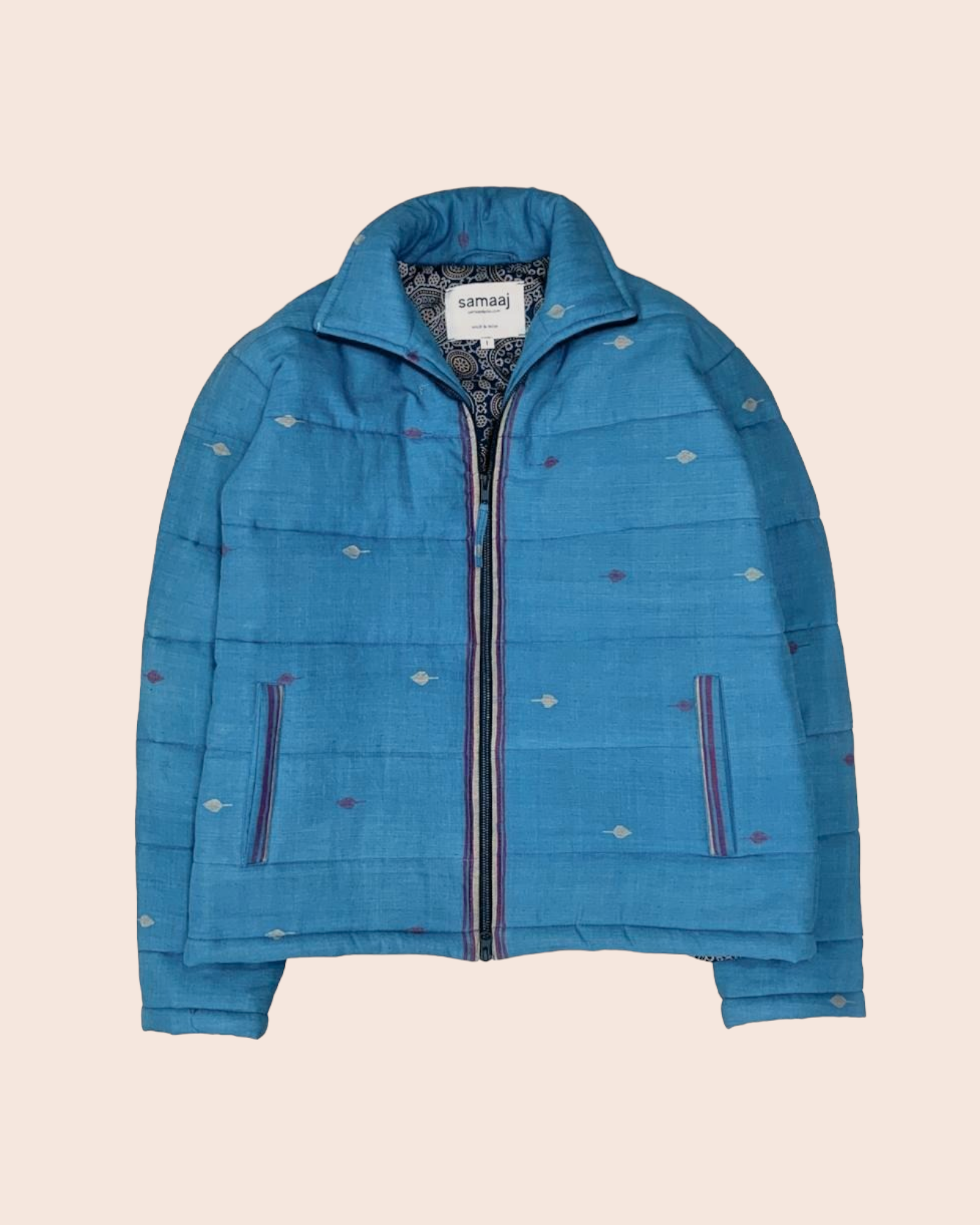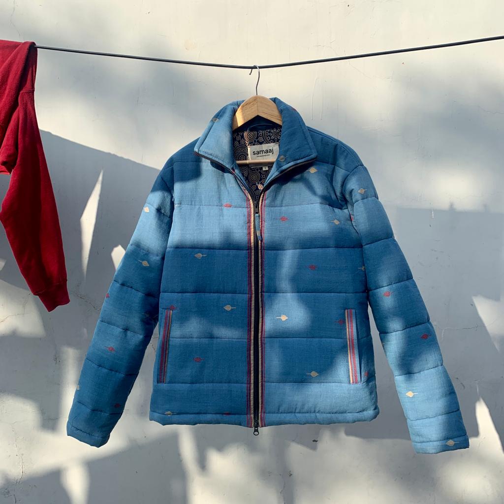 Jamdani puffer jacket made by handwoven Jamdani fabric. The Jamdani weave is a supplementary weft technique of weaving, where the artistic motifs are produced by a non-structural weft, in addition to the standard weft that holds the warp threads together. Finished with selvedge detailing on the zippers and pockets. To know more about the technique CLICK HERE