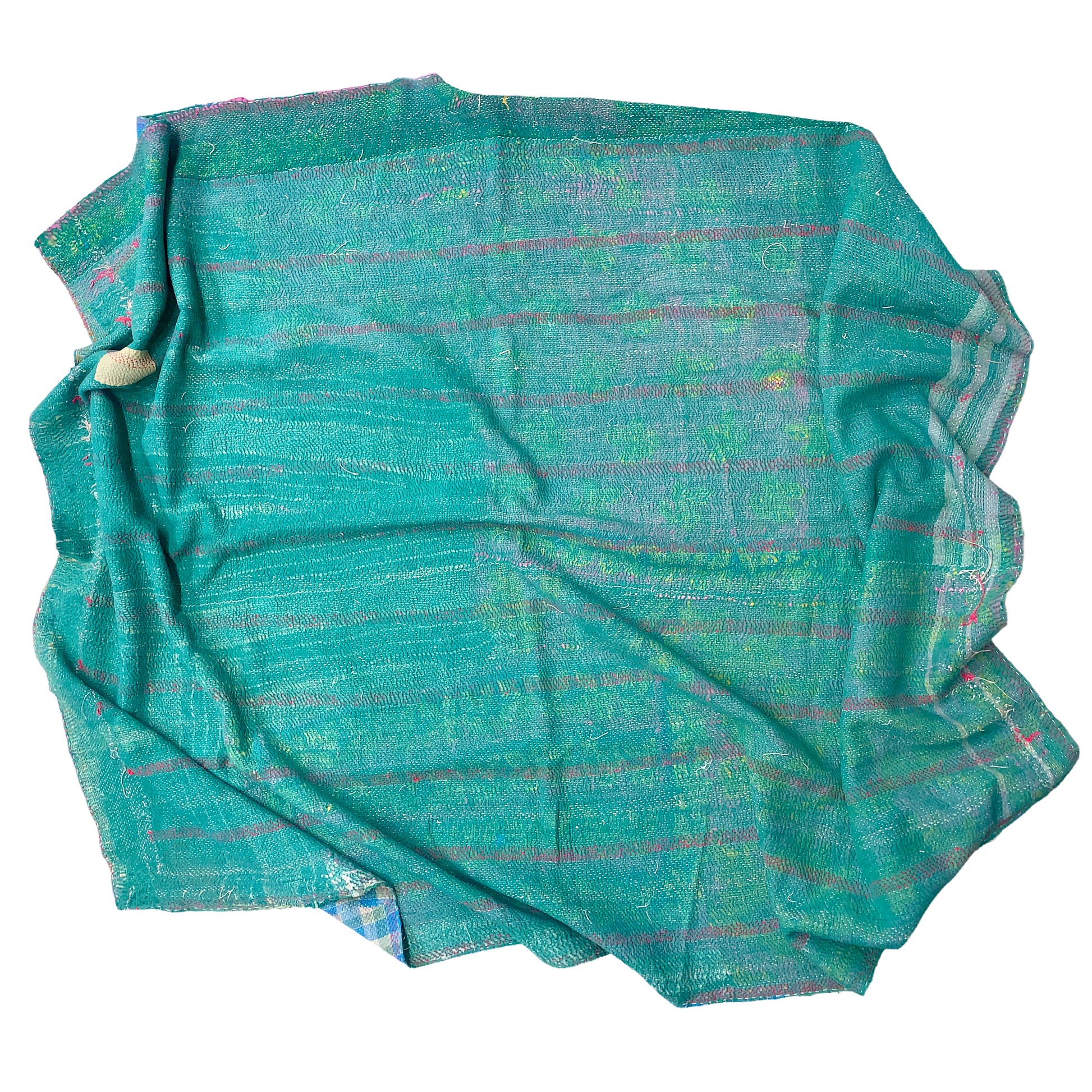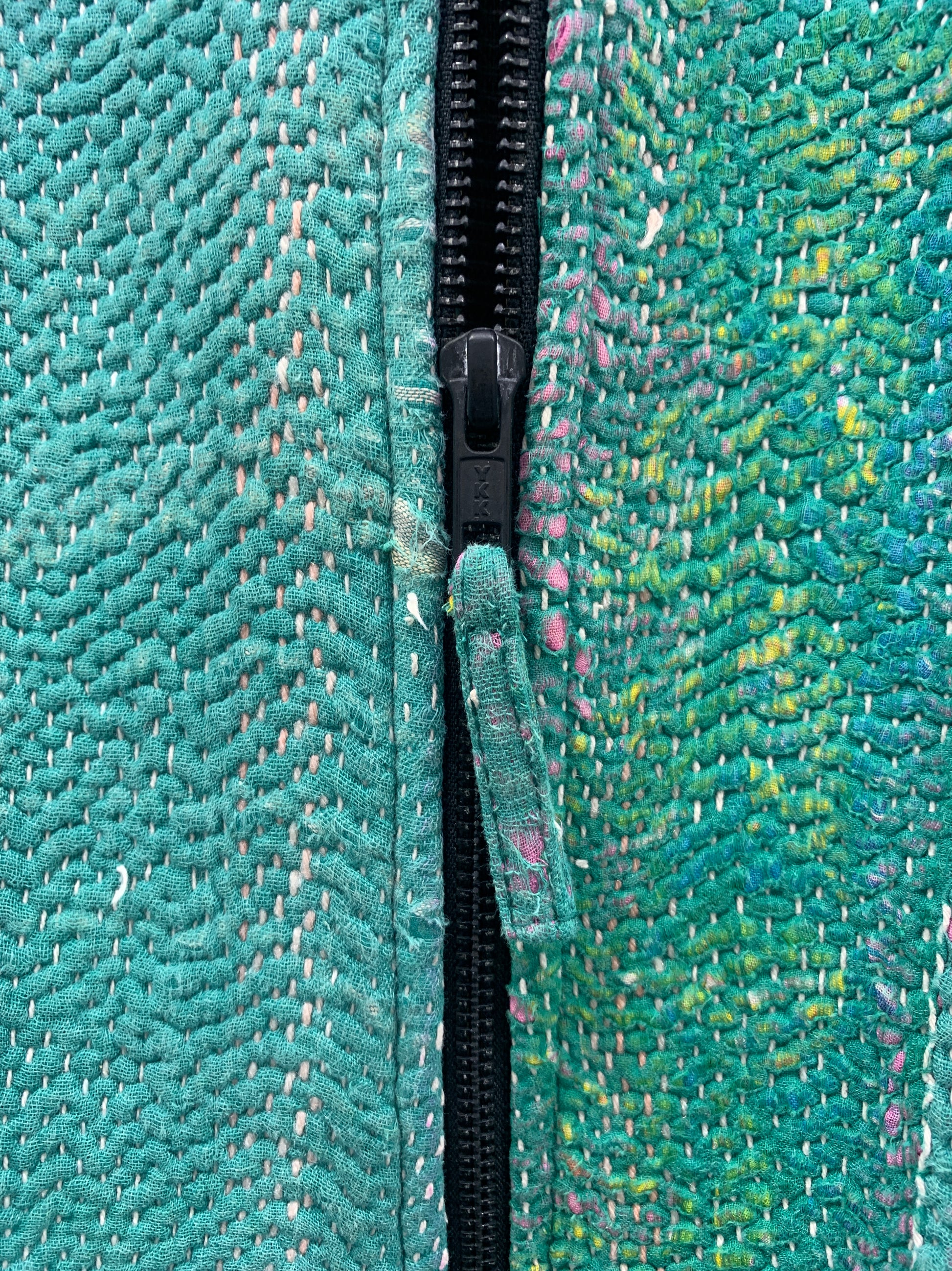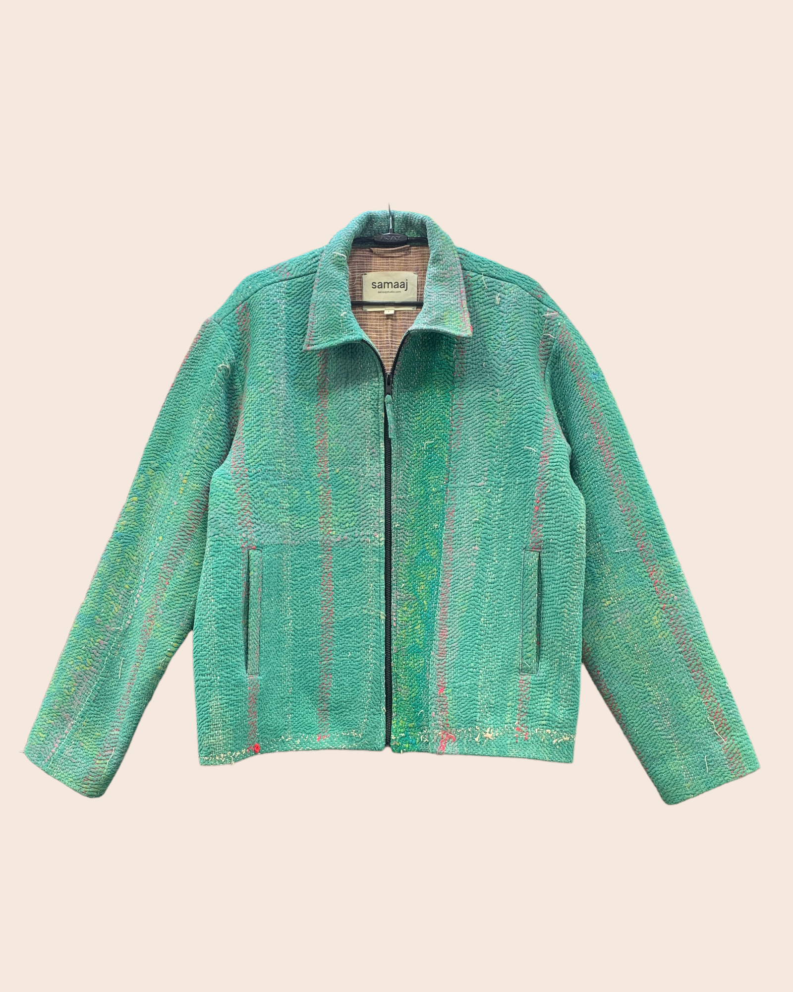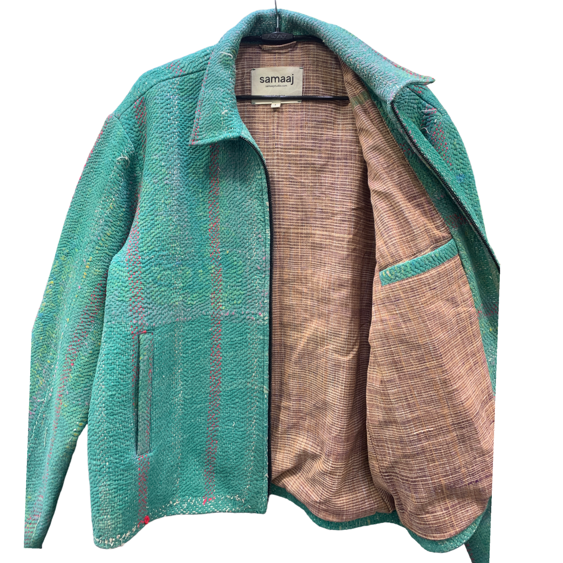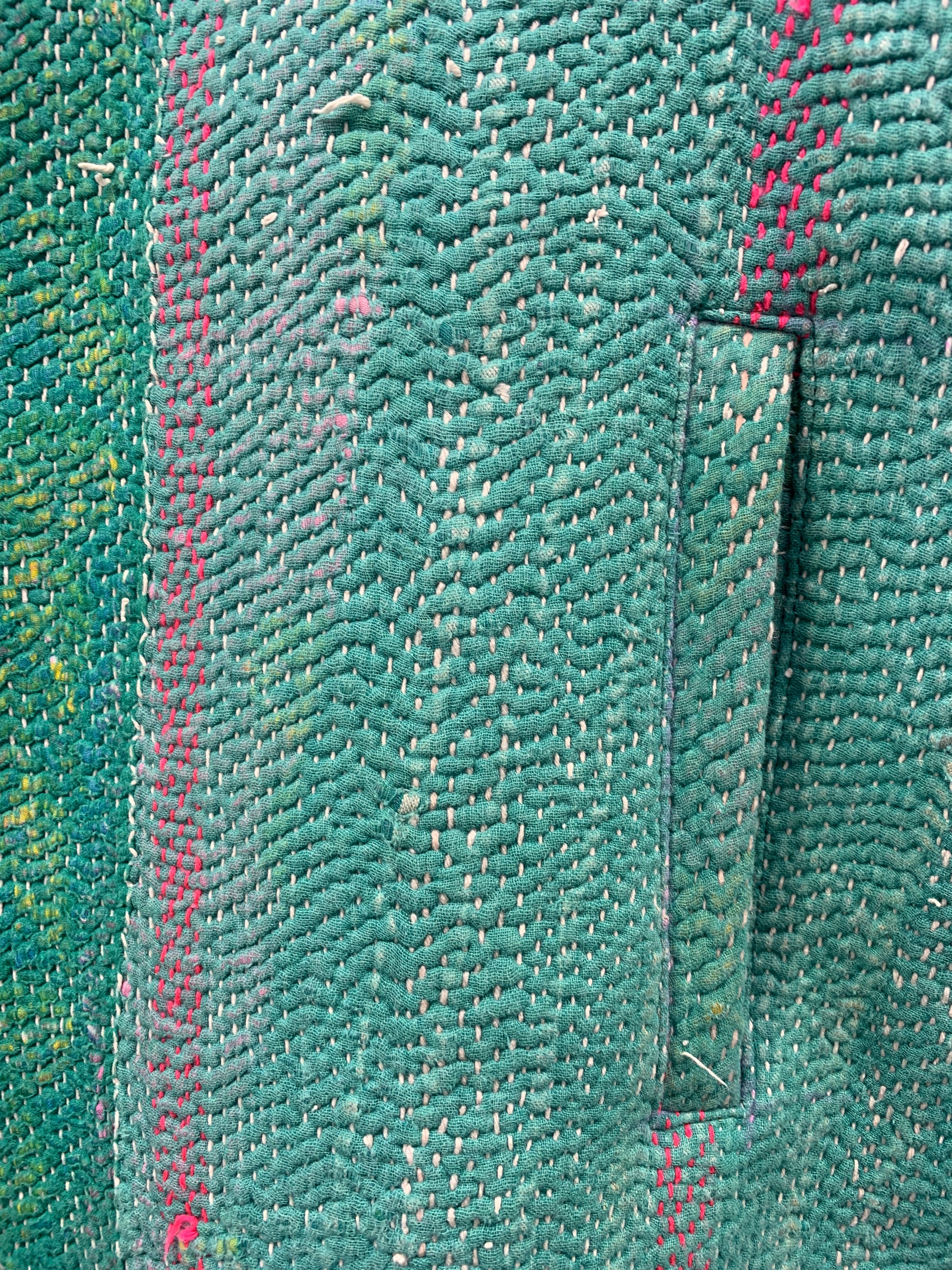 Vintage green jacket made out of 1980s vintage blanket. This blanket is made by hand stitching 3-4 old bedsheets together to form a thicker layer. This technique is called Kantha native to West Bengal and Bangladesh. Lined with hand-spun and handwoven cotton which is naturally dyed.