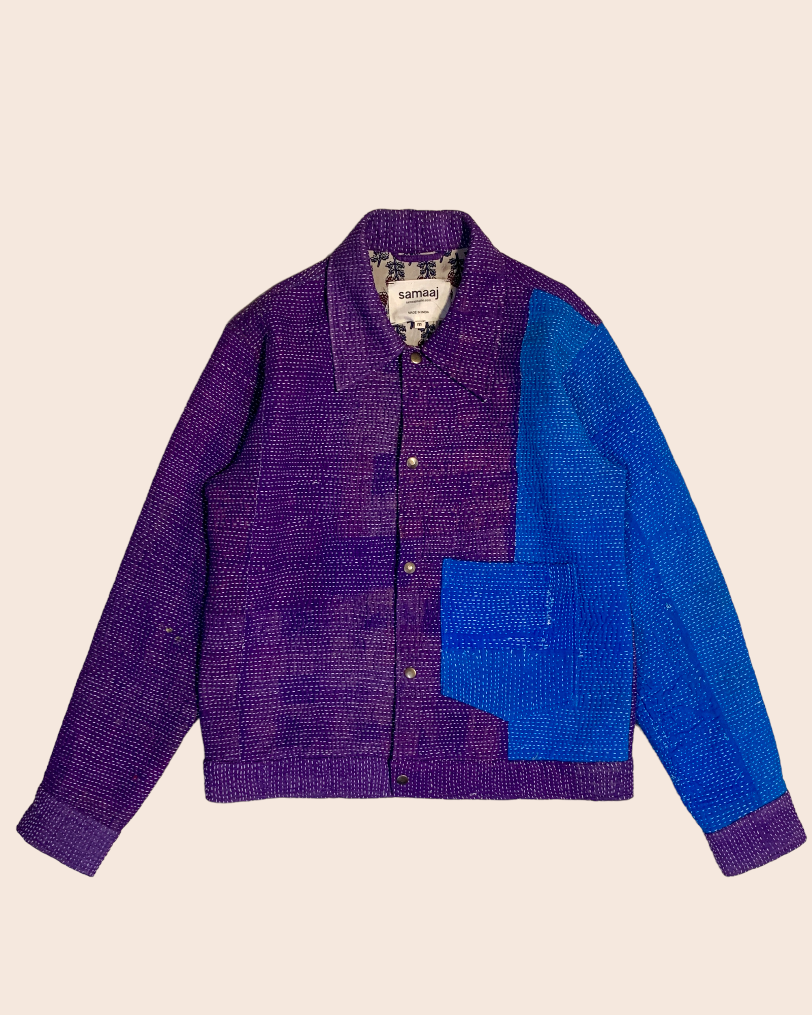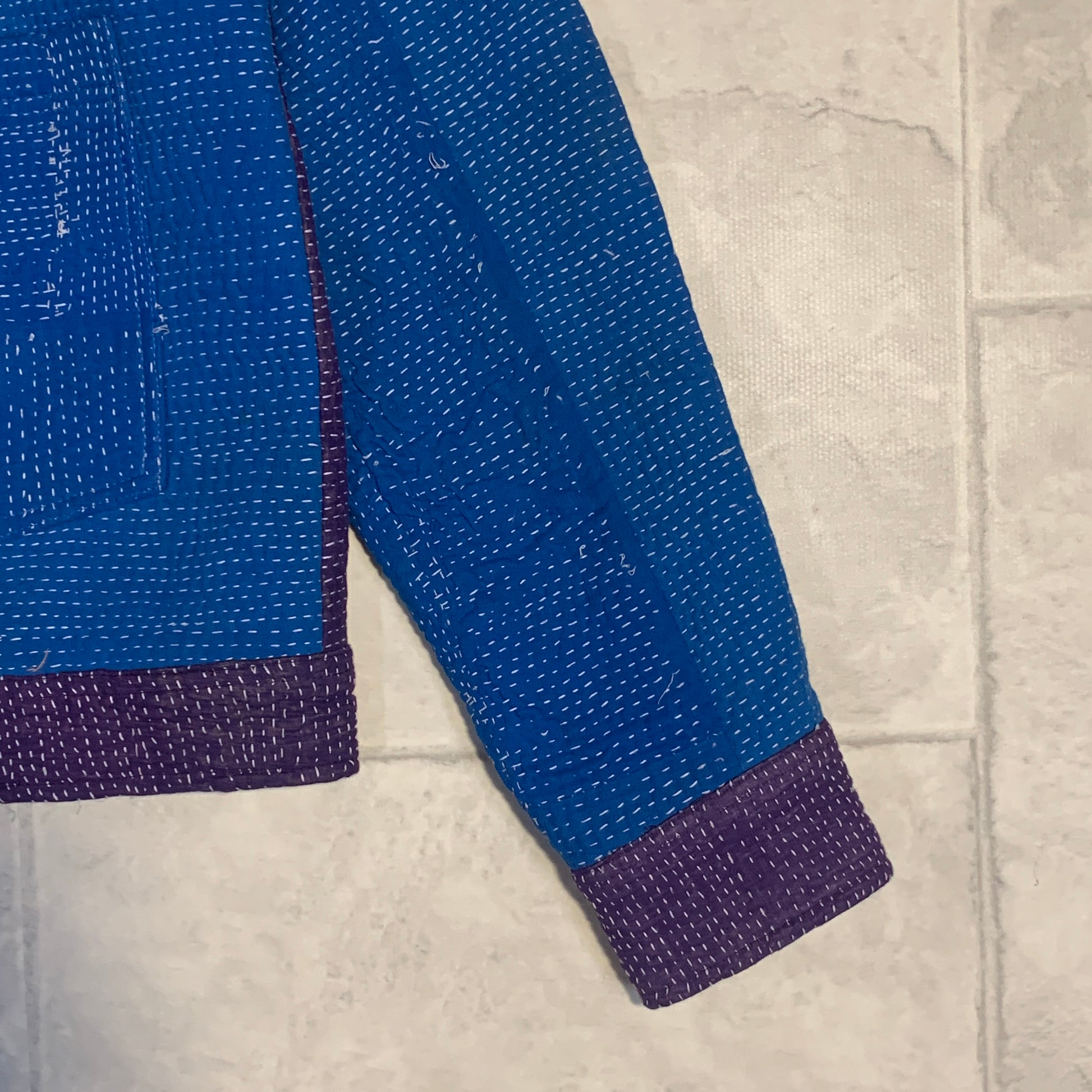 Vintage jacket made out of 1970s vintage Quilt. This Quilt is made by hand stitching 3-4 old bedsheets together to form a thicker layer. This technique is called Kantha native to West Bengal and Bangladesh. Lined with hand block printed bemberg silk.