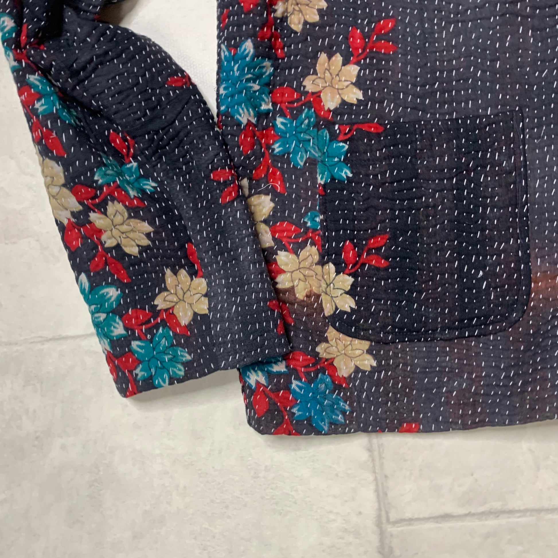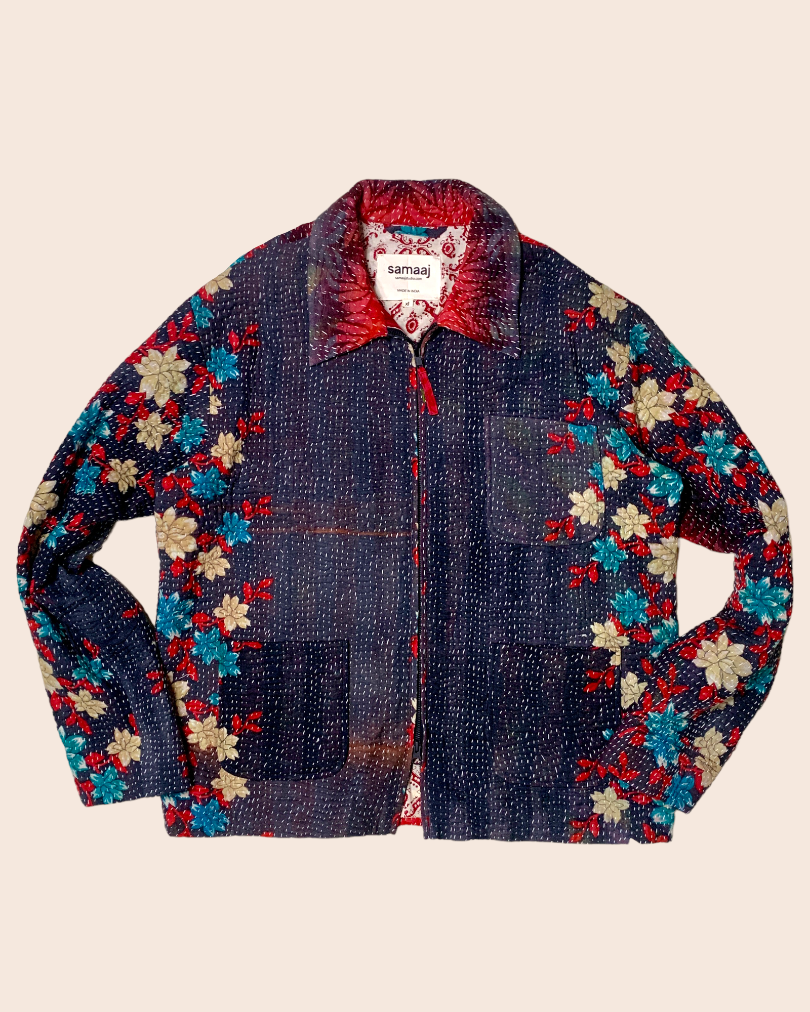 Vintage patchwork jacket made out of 1970s vintage quilt. This quilt is made by hand stitching 3-4 old bedsheets together to form a thicker layer. This technique is called Kantha native to West Bengal and Bangladesh. Lined with hand-block printed, handwoven cotton and naturally dyed.