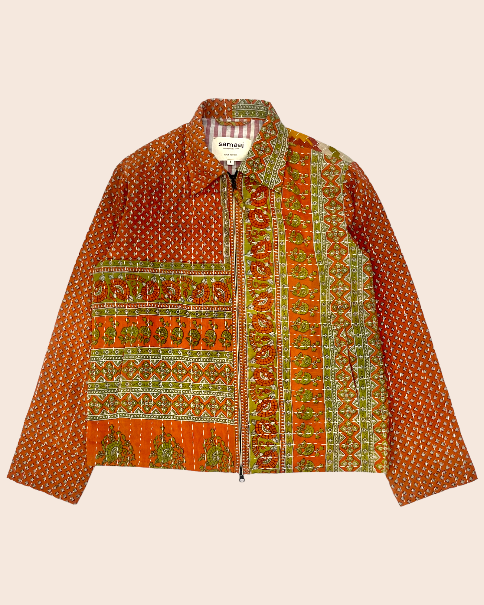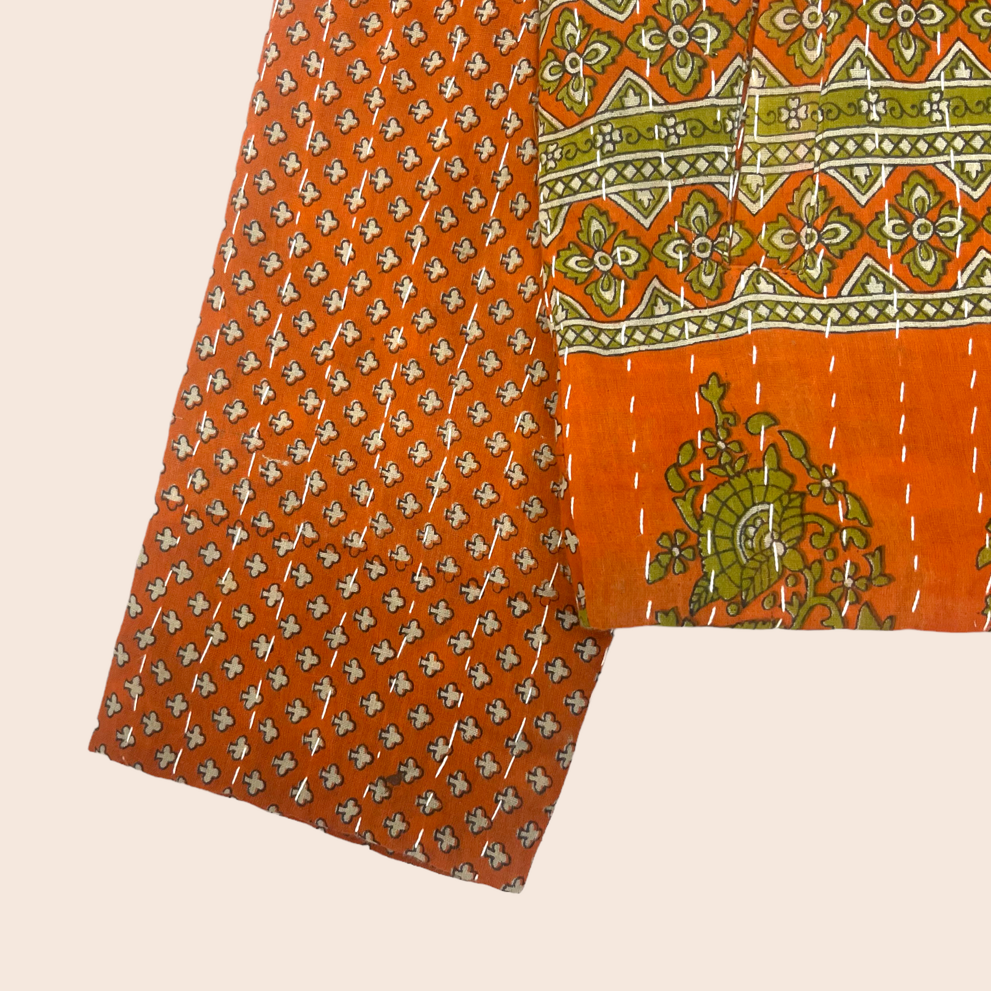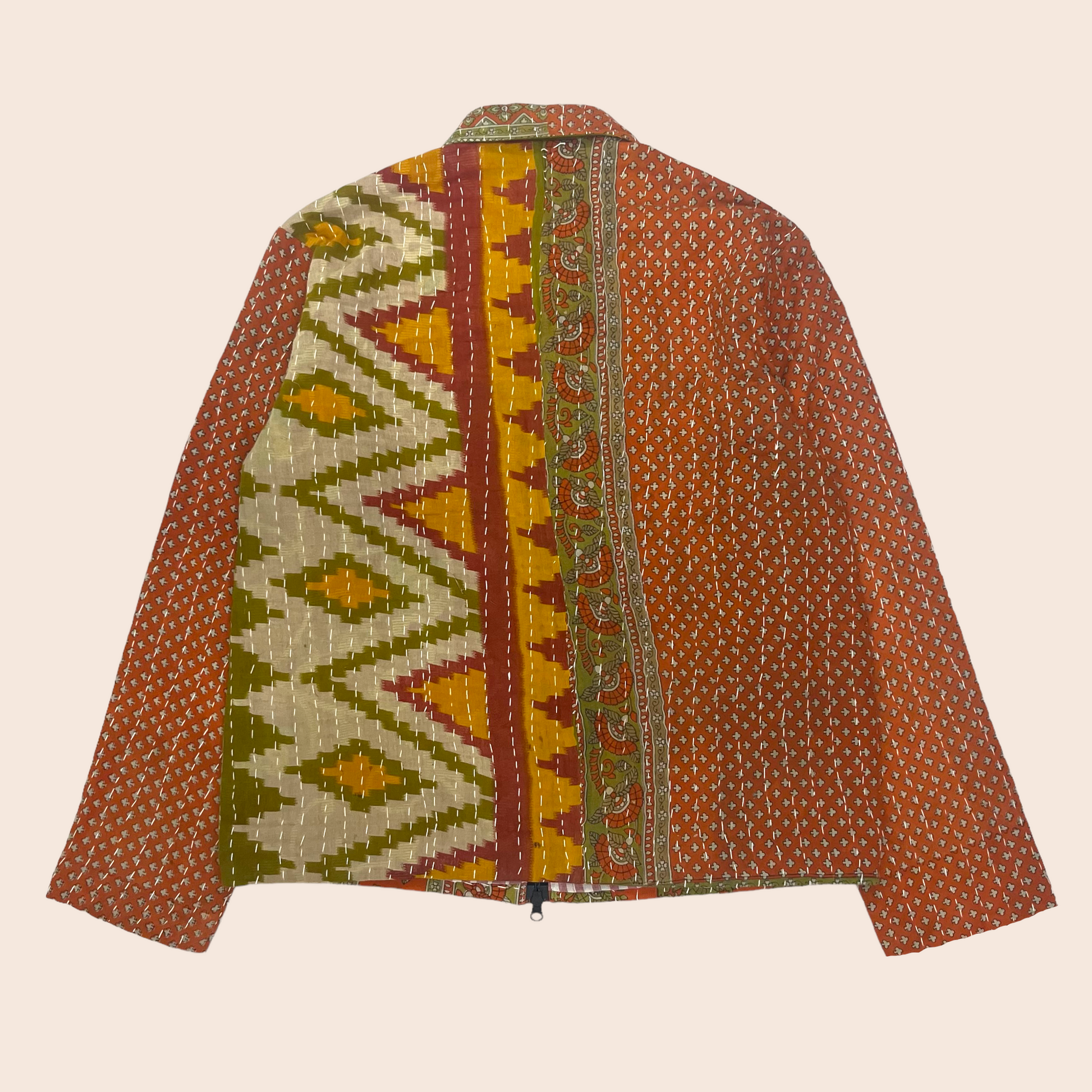 Vintage indigo jacket made out of 1980s vintage dead stock bedsheet. This bedsheet is made by hand stitching 3-4 old bedsheets together to form a thicker layer. This technique is called Kantha native to West Bengal and Bangladesh. Lined with hand-spun and handwoven cotton which is naturally dyed.