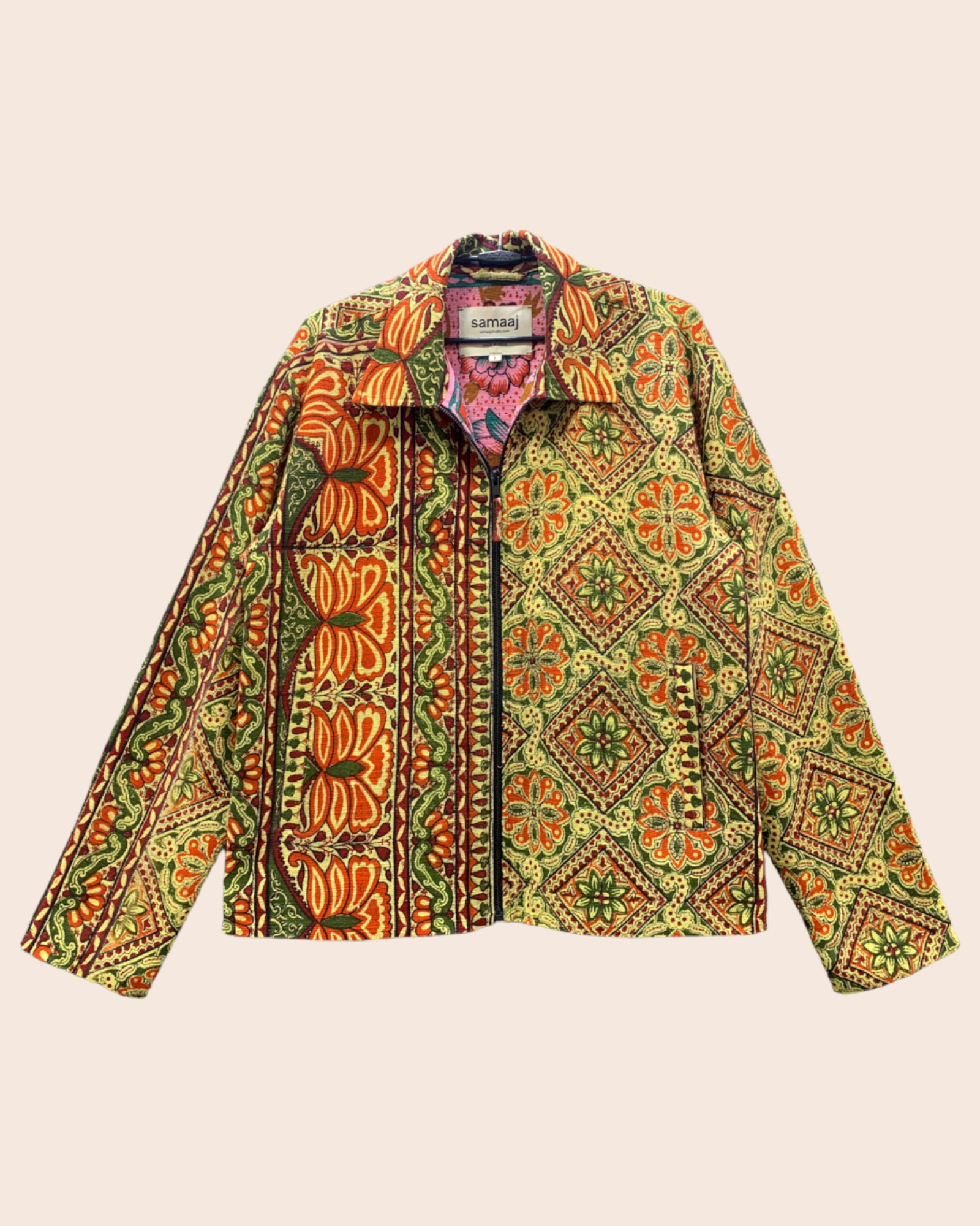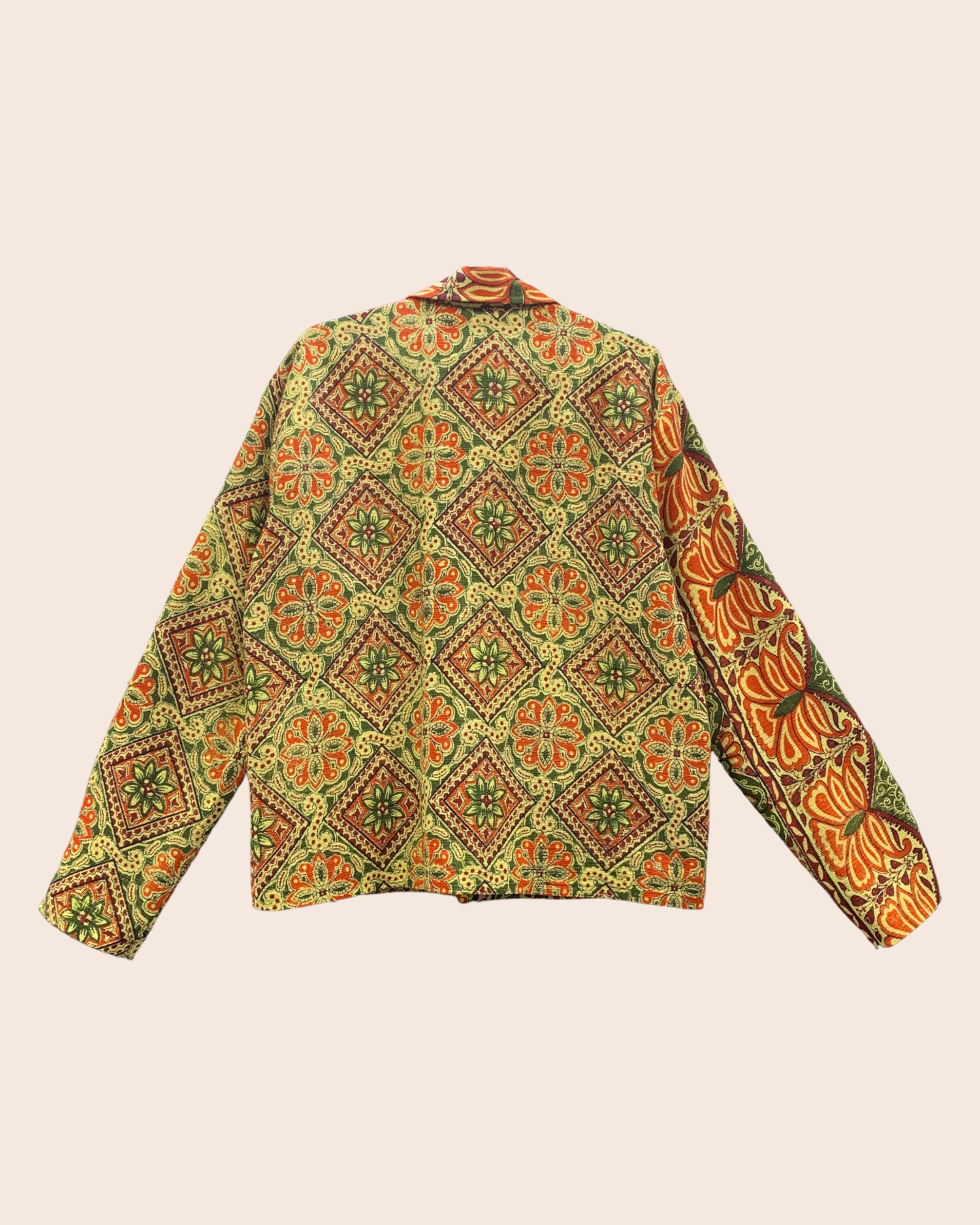 Vintage yellow jacket made out of 1990s vintage bedsheet. This bedsheet is handwoven by the weavers of Bhagalpur, Bihar.Further it is block printed with natural dyes in Jaipur, Rajasthan. Lined with handwoven and block printed cotton which is naturally dyed.