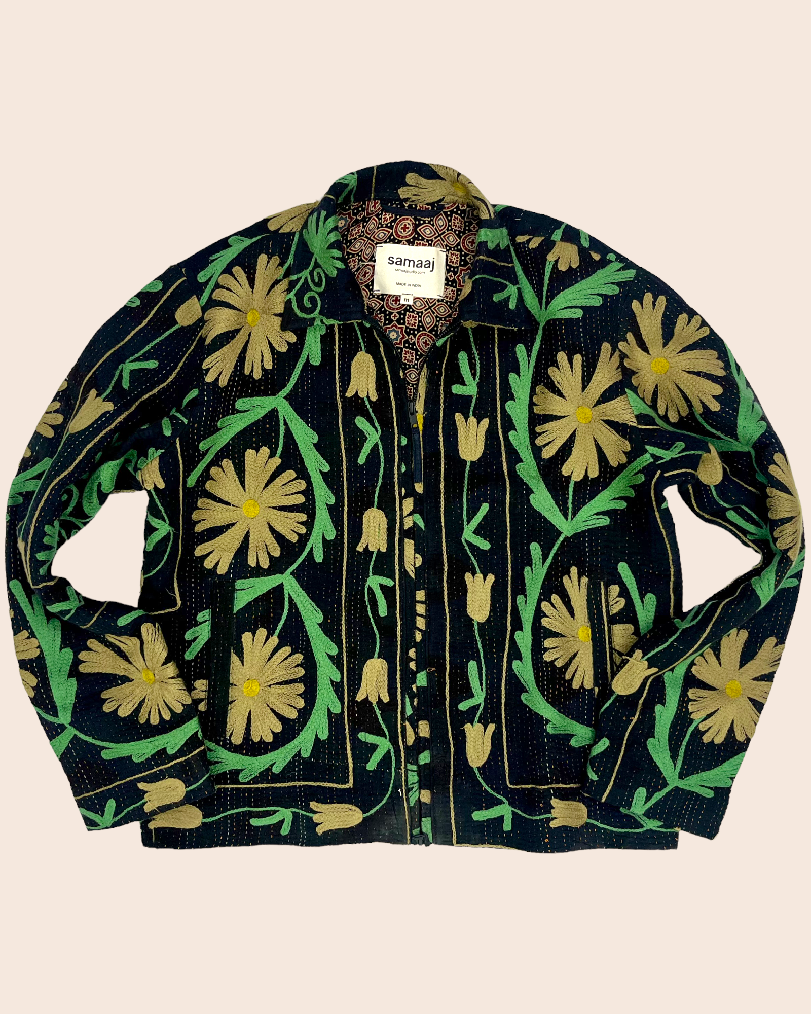 Vintage Suzani embroidered jacket made out of 1970s vintage blanket. This blanket is made by hand stitching 3-4 old bedsheets together to form a thicker layer. This technique is called Kantha native to West Bengal and Bangladesh. Lined with Block printed bemberg silk.