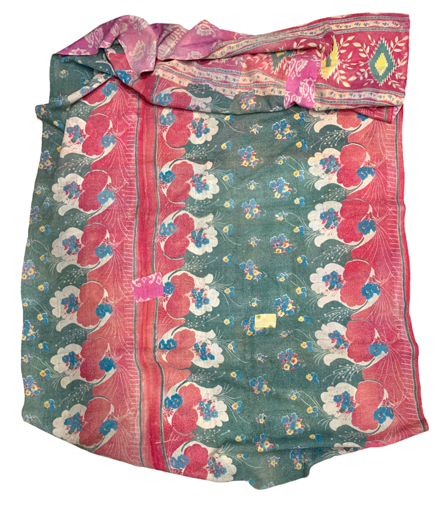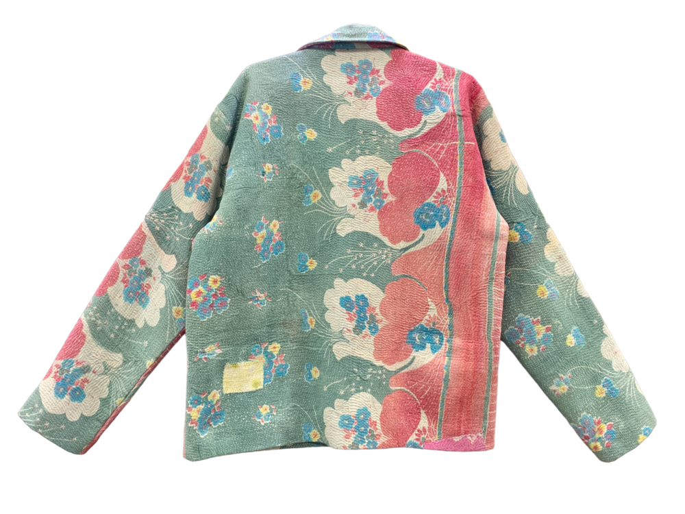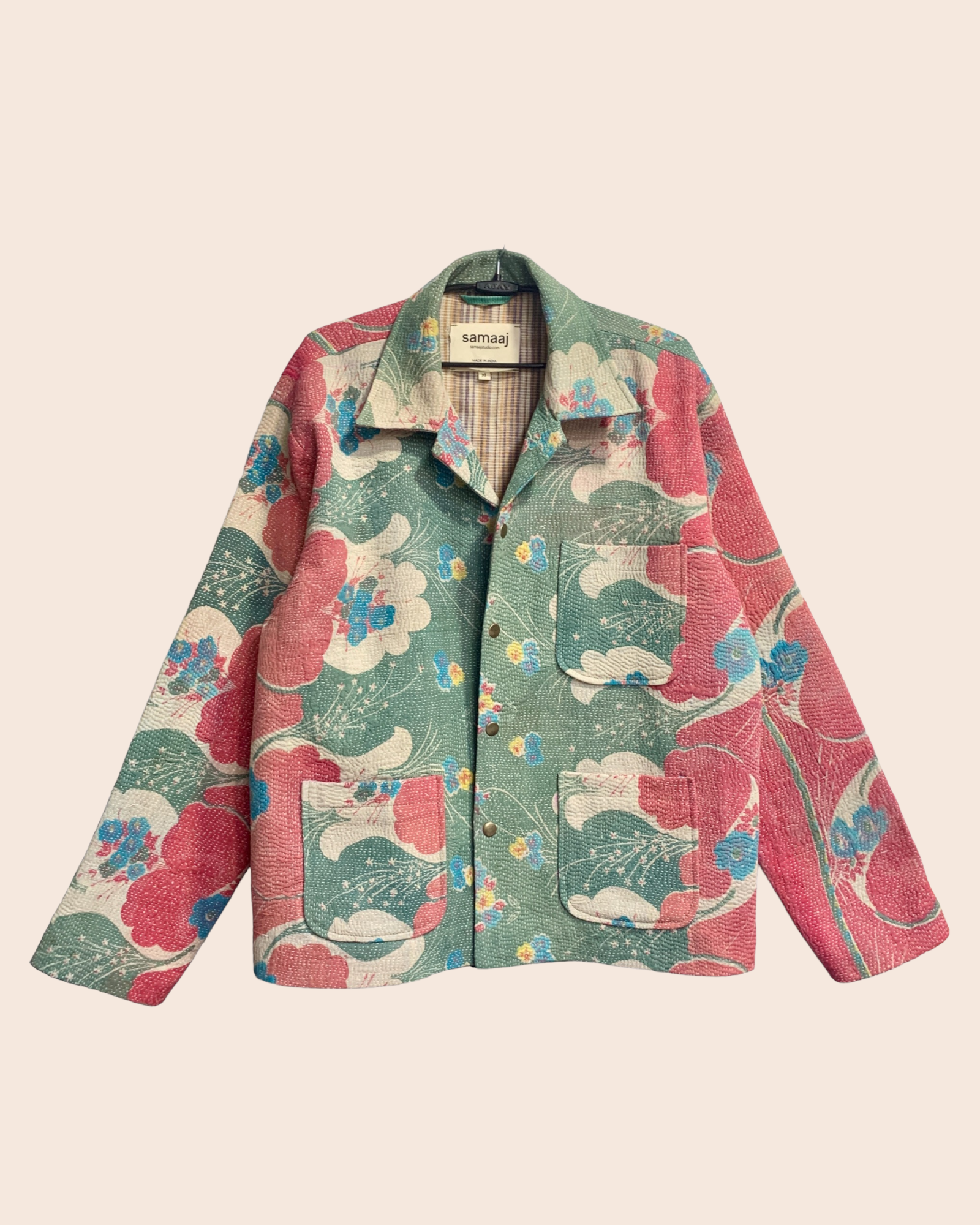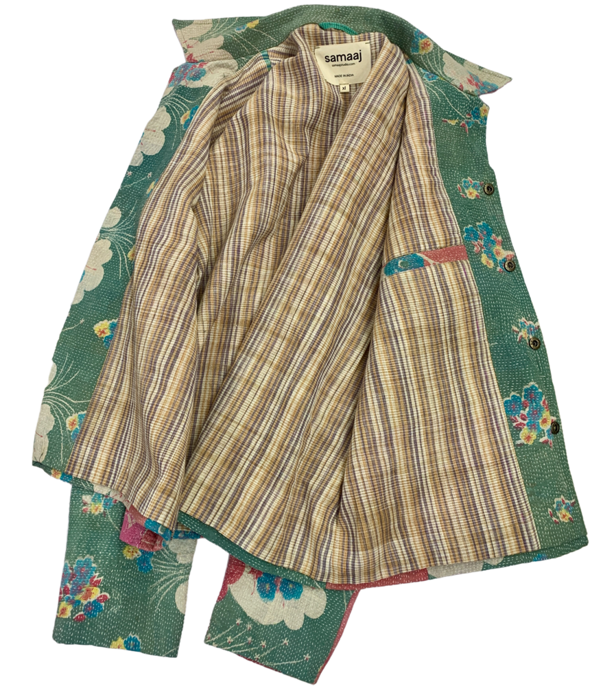 Vintage green jacket made out of 1960s vintage blanket. This blanket is made by hand stitching 3-4 old bedsheets together to form a thicker layer. This technique is called Kantha native to West Bengal and Bangladesh. Lined with hand-spun and handwoven cotton which is naturally dyed.