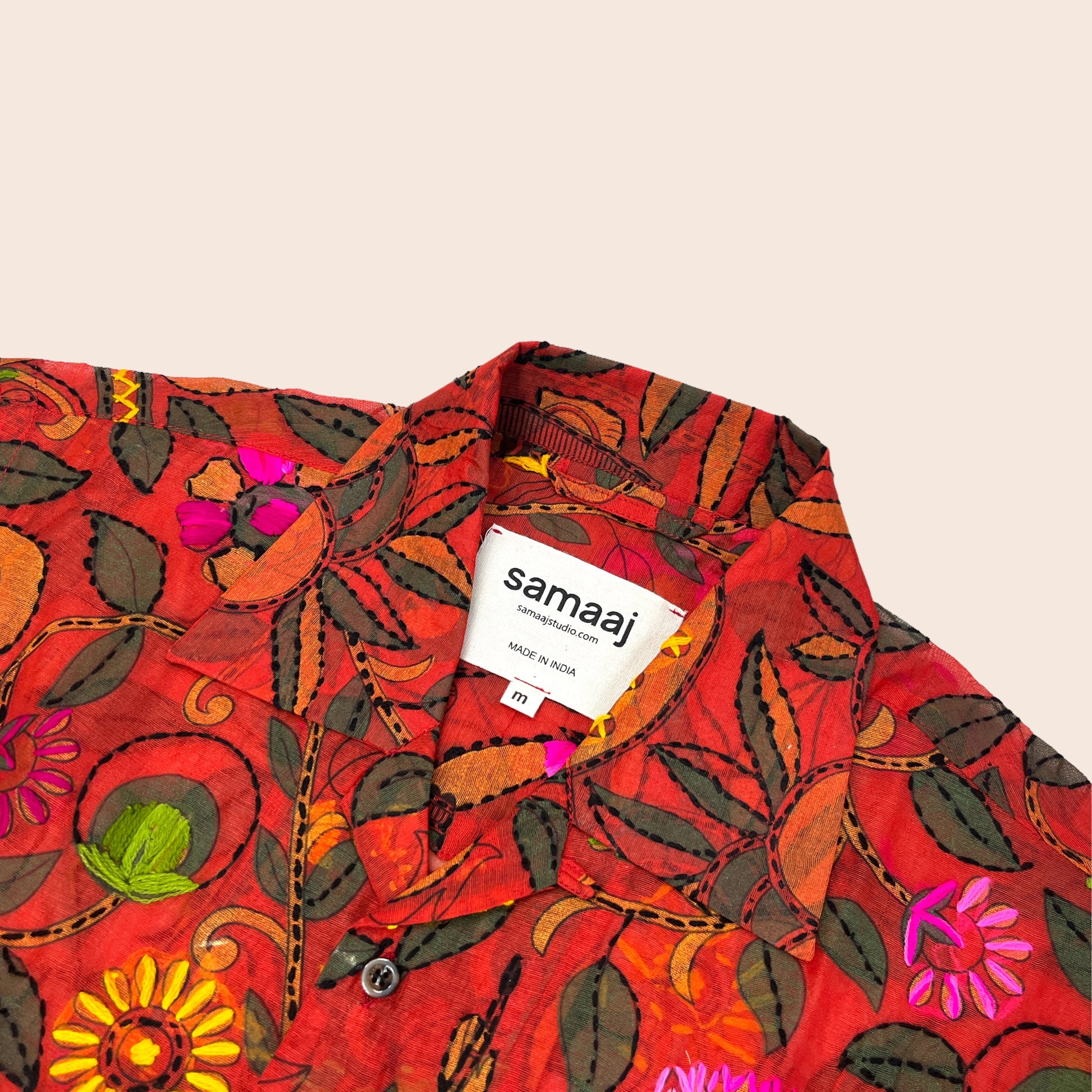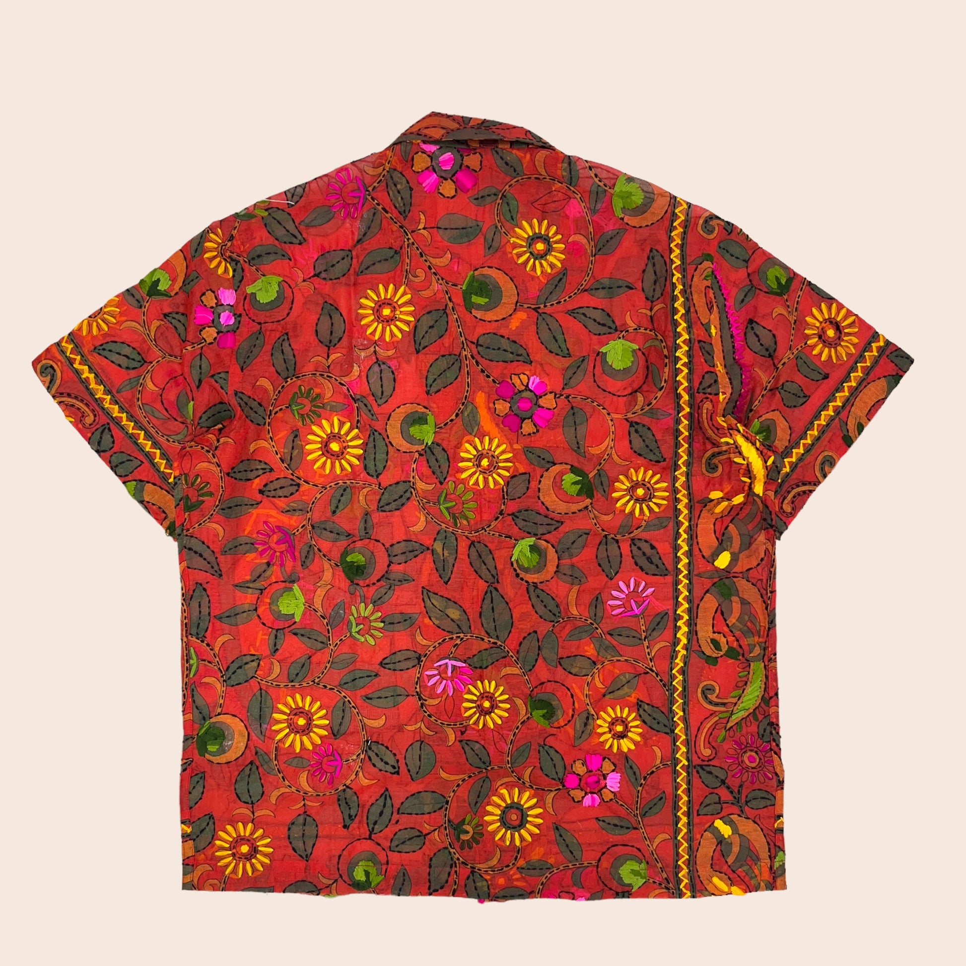 1/1 Vintage silk shirt made out of 1990s vintage dead-stock saree. This saree is hand block printed and further hand embroidered with NAKSHI KANTHA technique by the weavers of West Bengal, India.