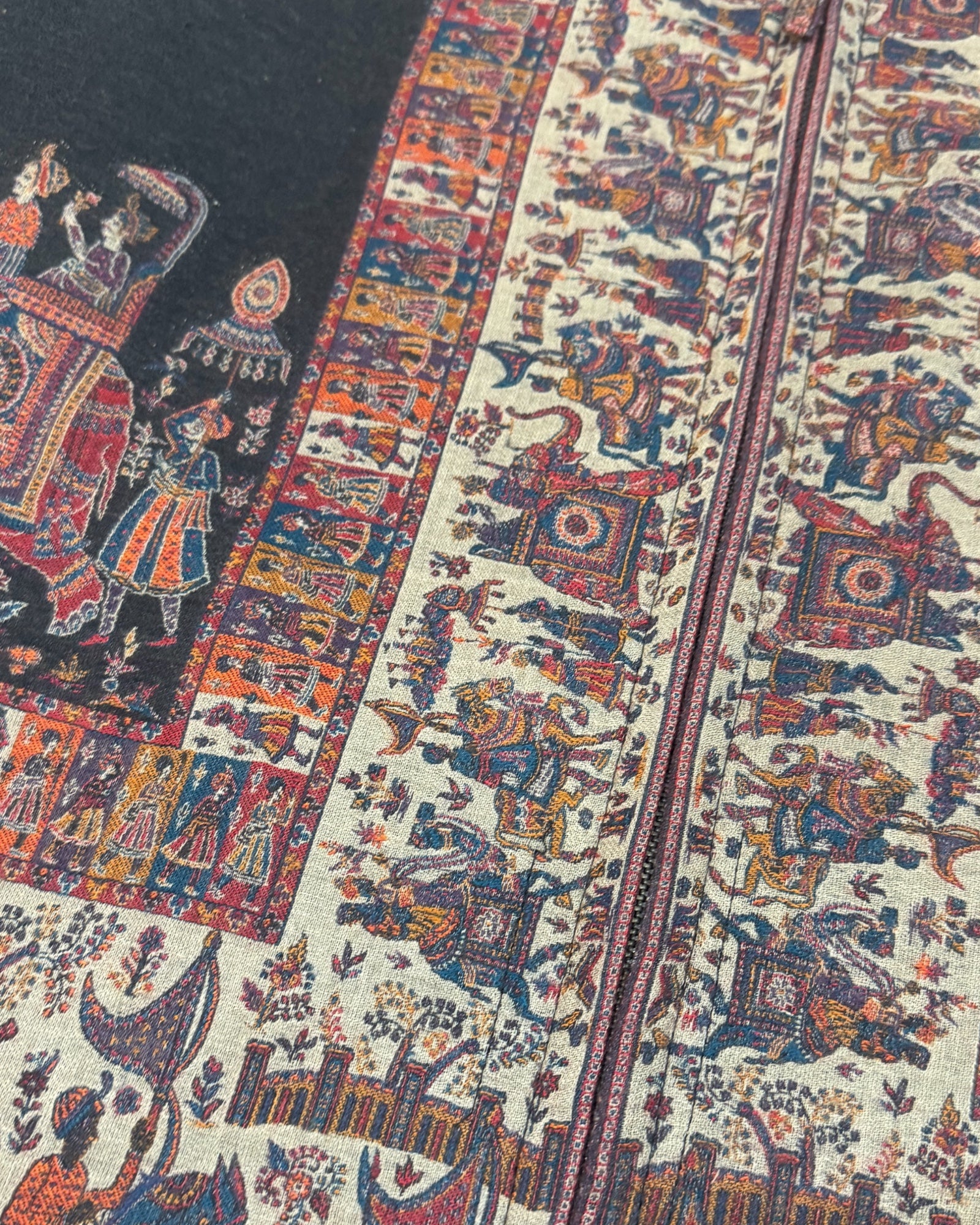 Pashmina hand woven jacket made from handwoven vintage pashmina wool shawl. Woven with the kani technique native to Kashmir region of India.