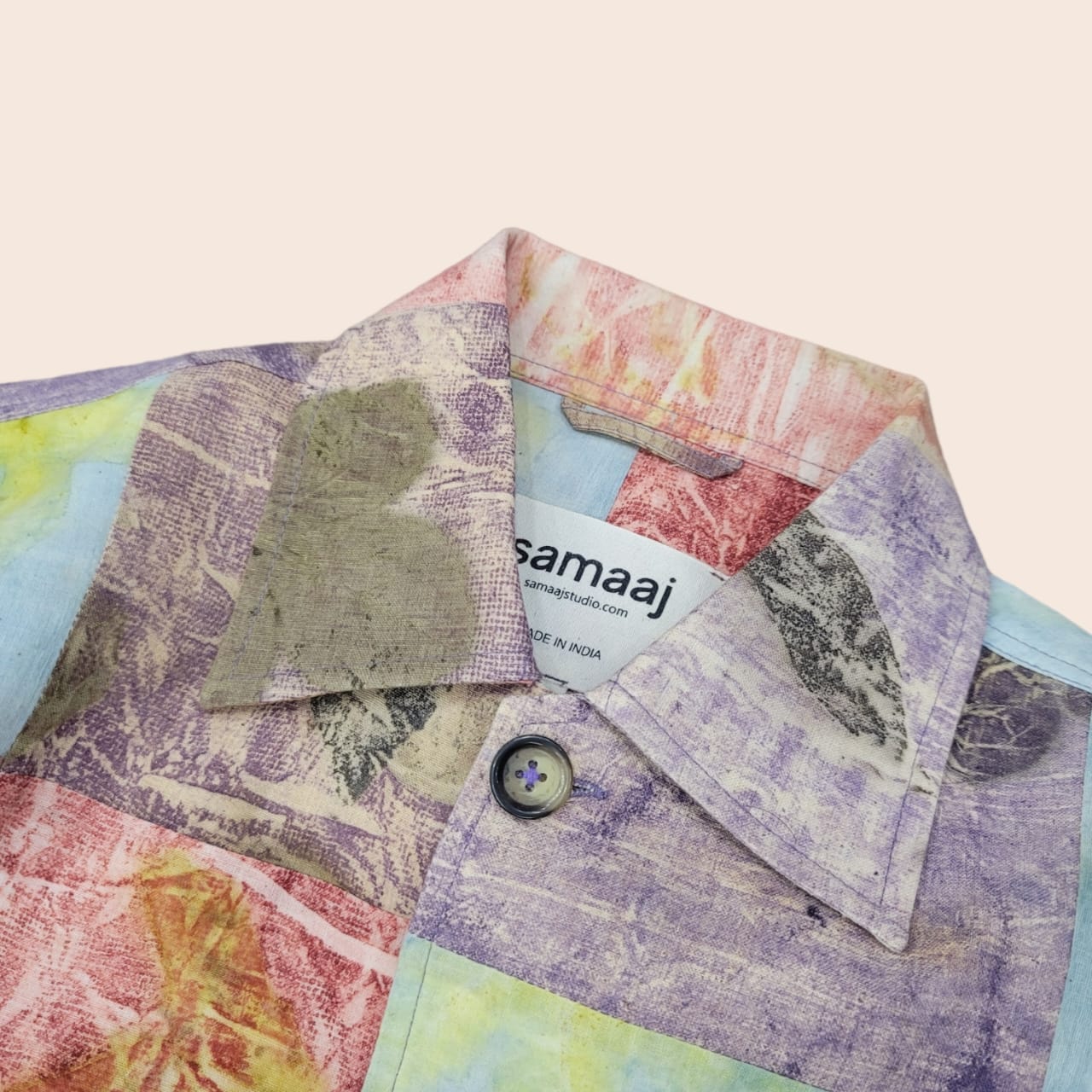 Patchwork shirt made from handspun and handwoven cotton (khadi), naturally dyed with Indian Blueberry (Jamun) and eco printed with leaves.
