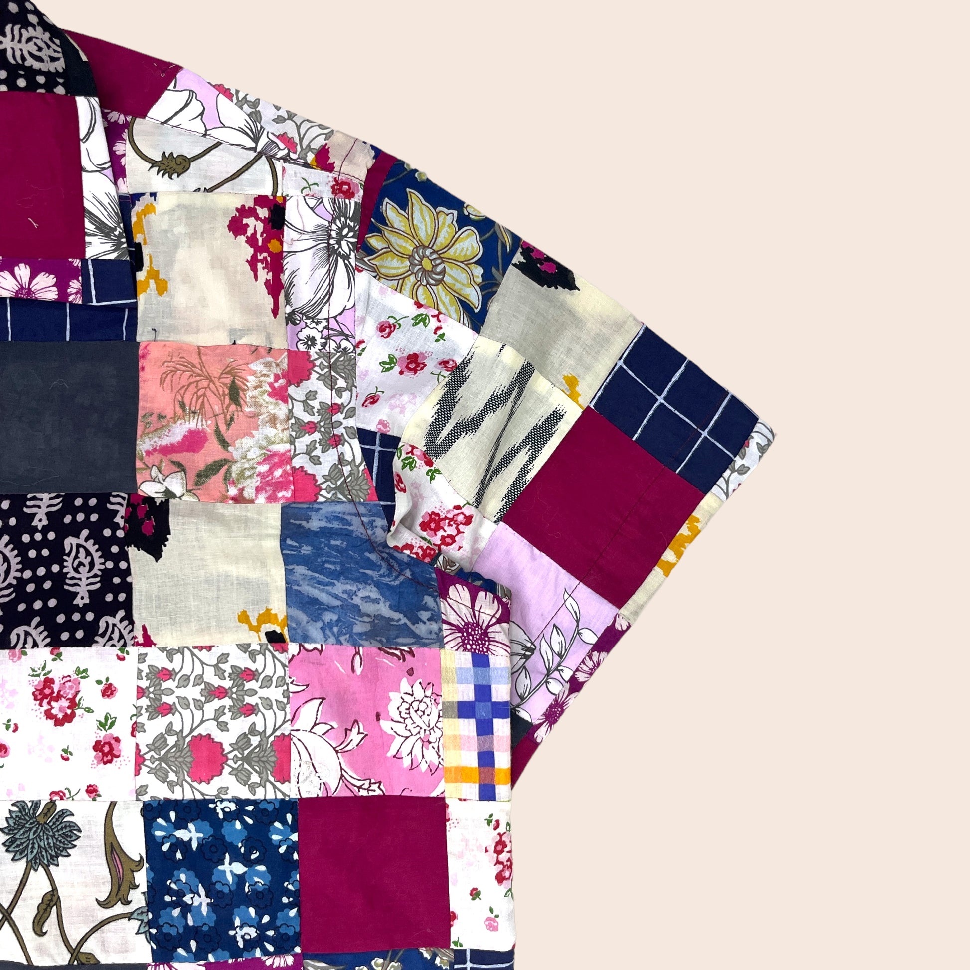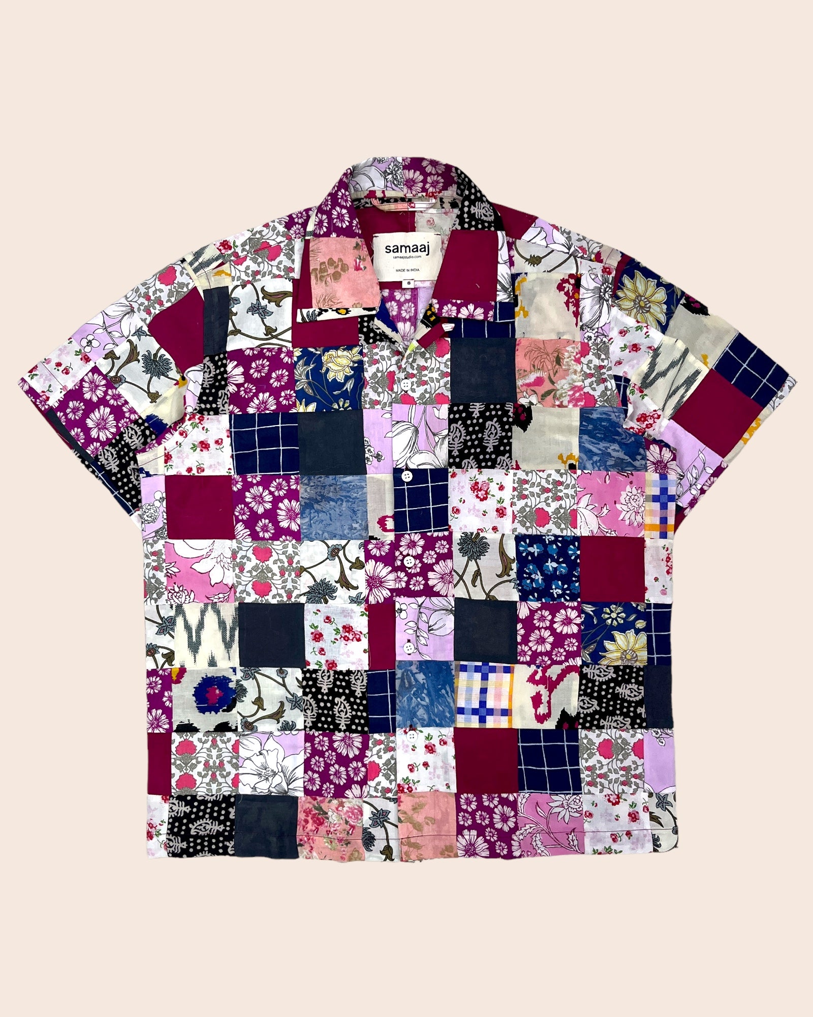 Patchwork shirt made by cutting small/waste yardage of hand block printed fabrics into small squares and then stitching them together to form a running fabric.