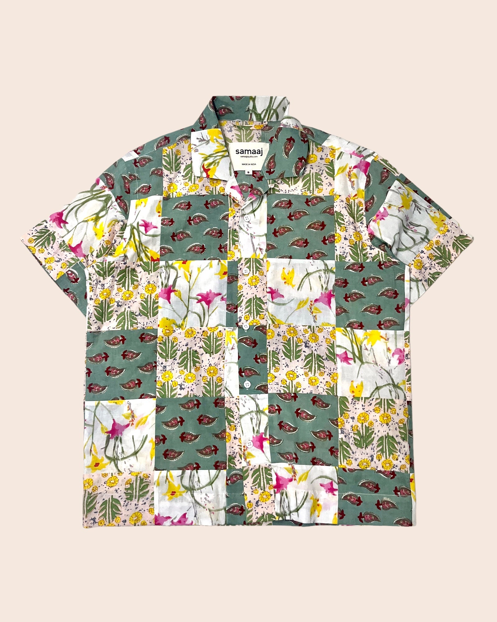 Patchwork shirt made by cutting small/waste yardage of hand block printed fabrics into small squares and then stitching them together to form a running fabric.