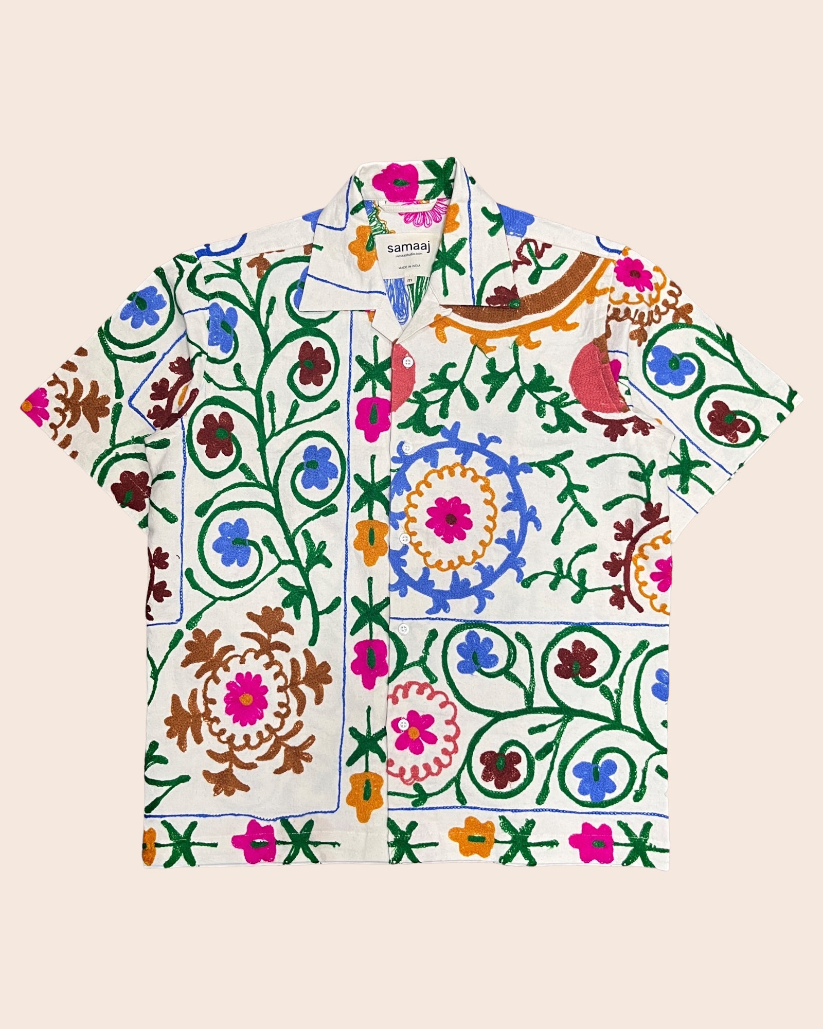 Suzani hand embroidered shirt made from handwoven cotton and hand embroidered with Suzani technique native to Uzbekistan. This particular shirt is made from vintage bed cover from 1980s.