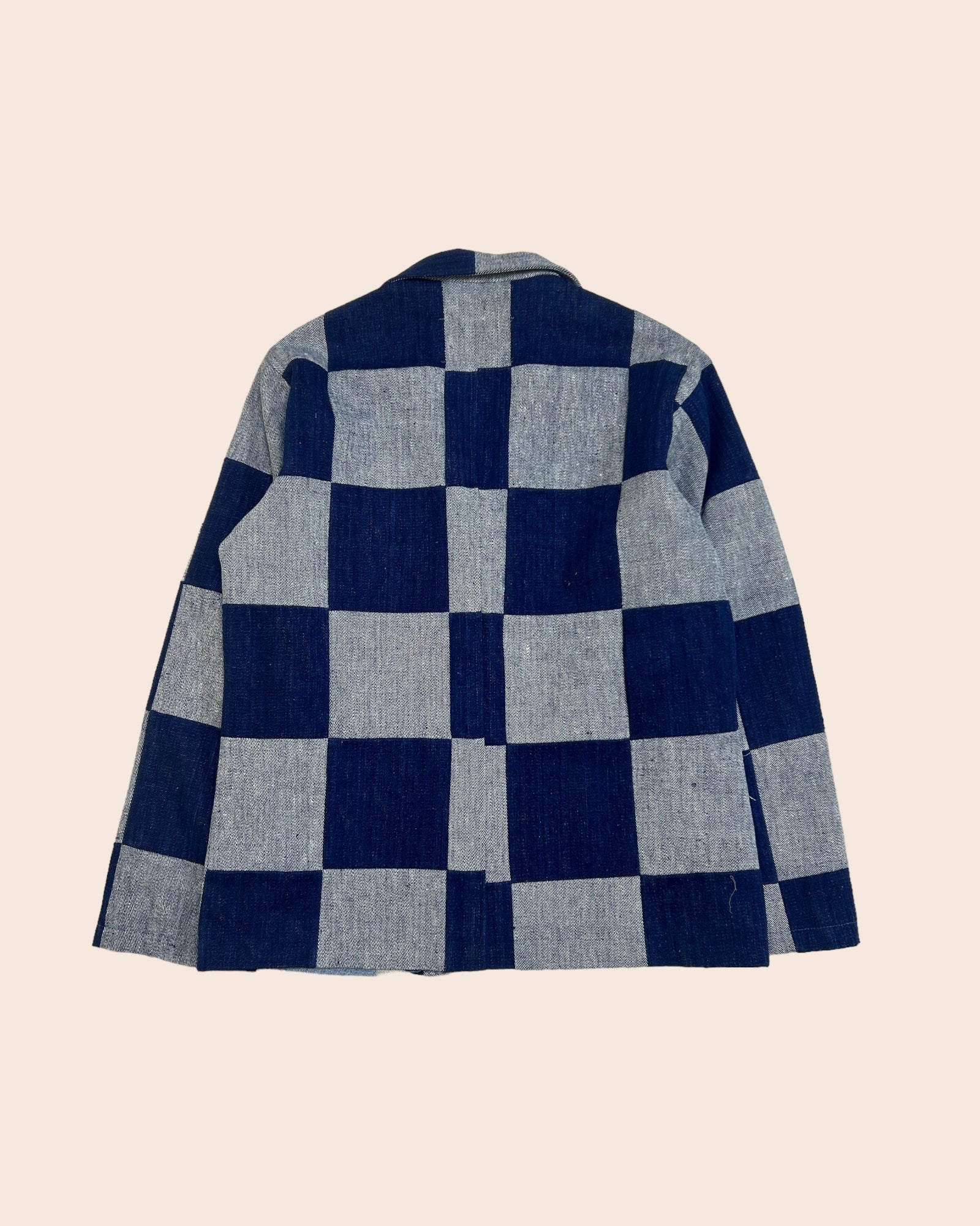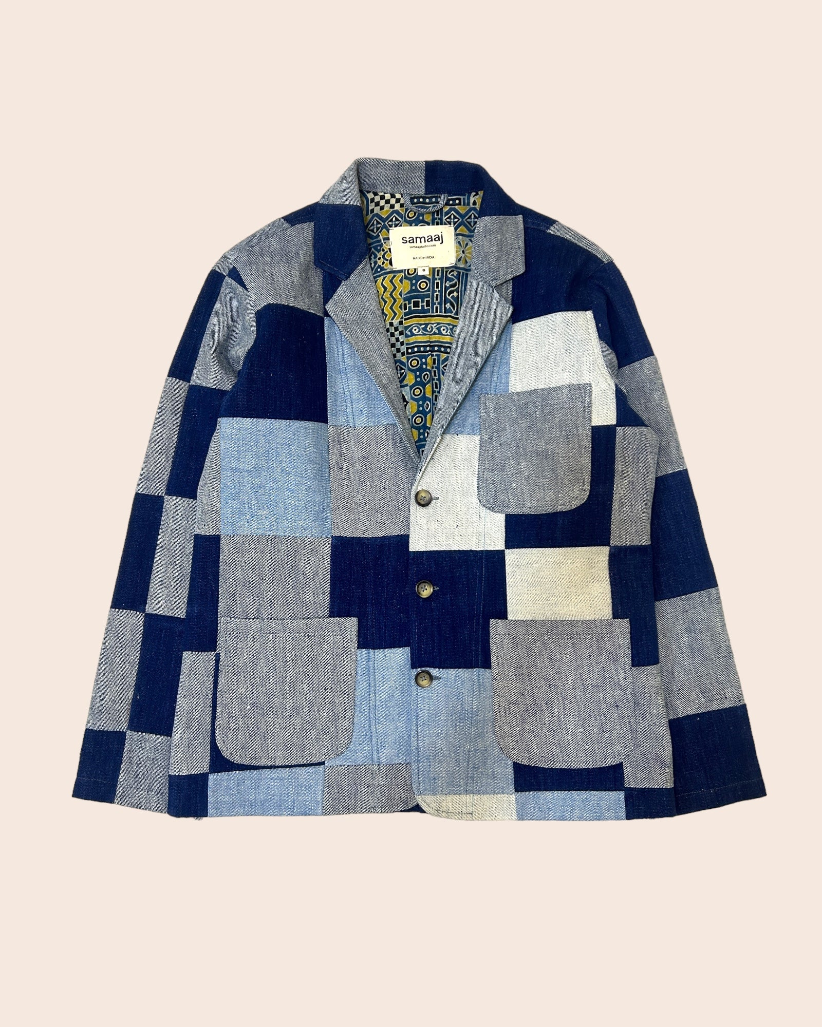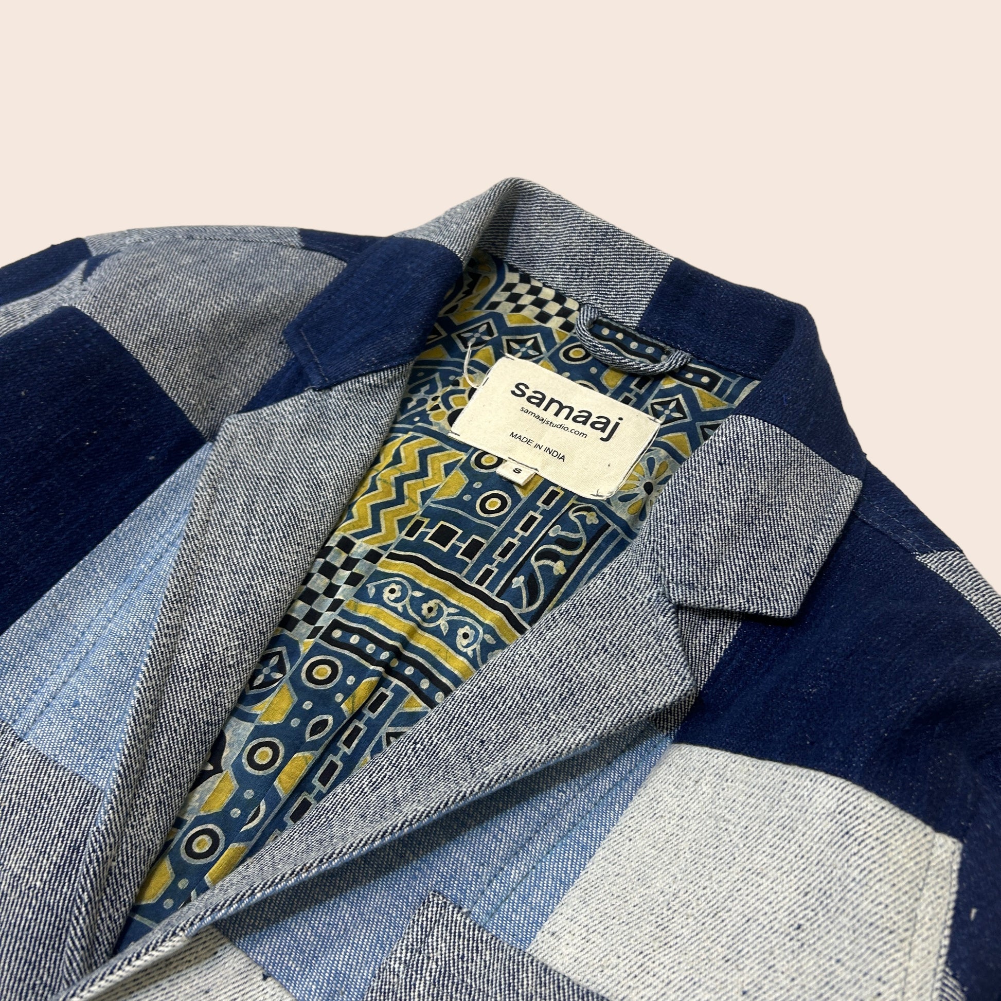 Up-cycled denim jacket made handwoven khadi denim scrap fabrics sourced from a village weaving facility in Gujurat.