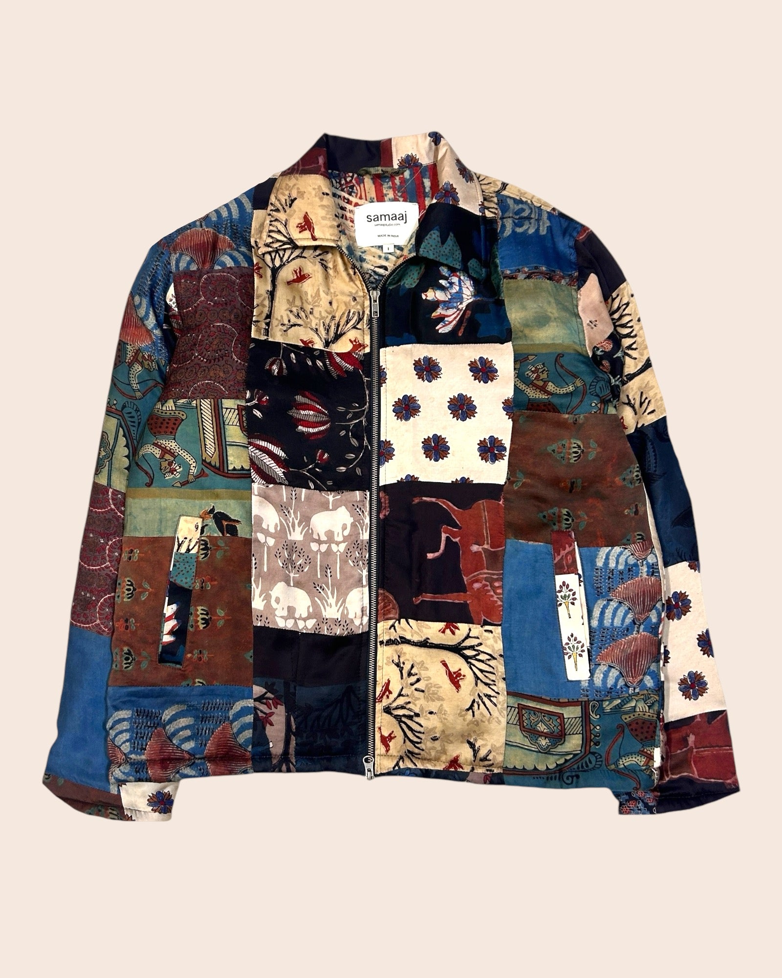 Up-cycled quilted silk jacket made from block printed silk scrap fabrics sourced from a nearby facility making silk stoles.