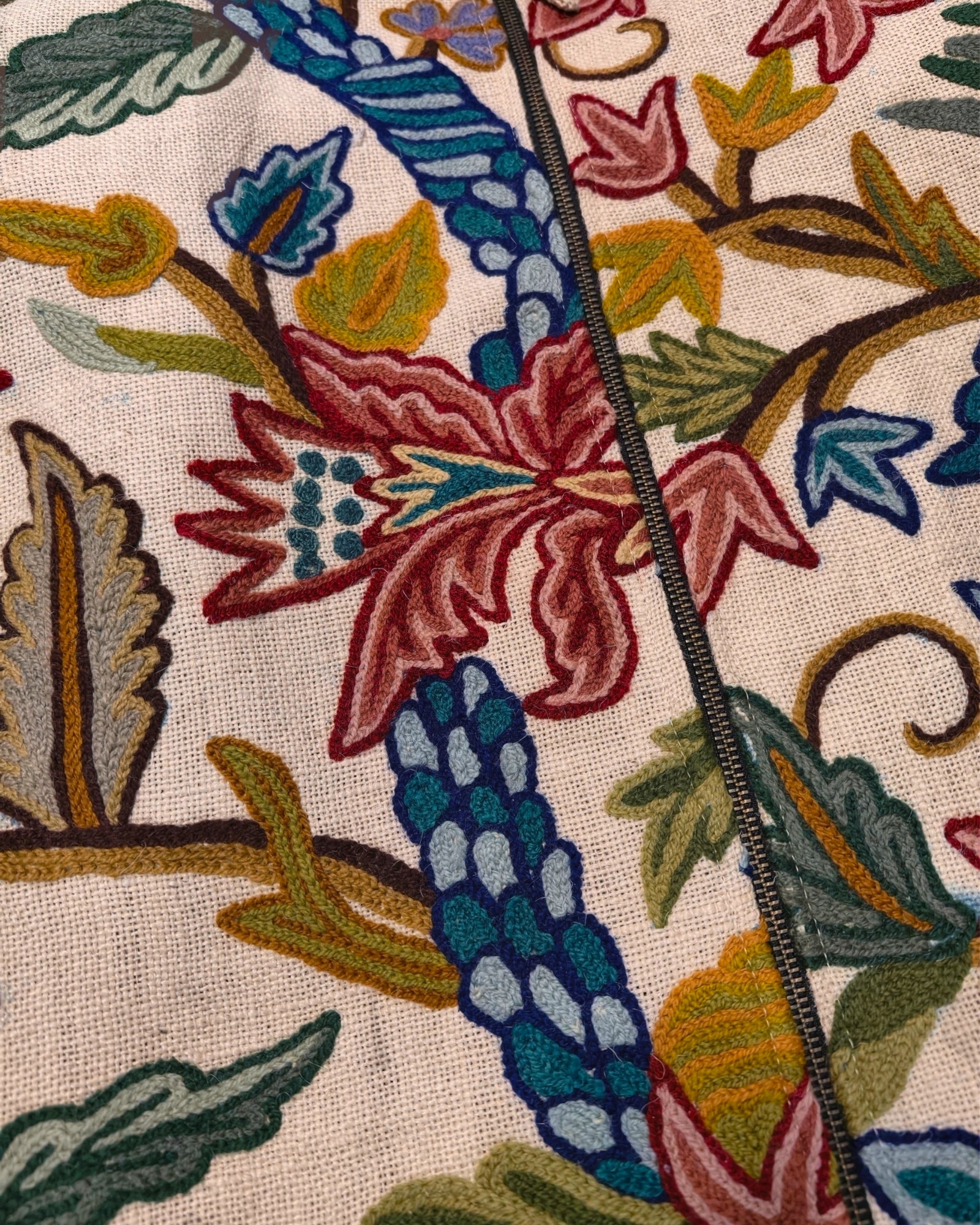 Suzani hand embroidered jacket made from handwoven cotton and hand embroidered with Suzani technique native to Kashmir region of India. This particular jacket is made from vintage bed cover.